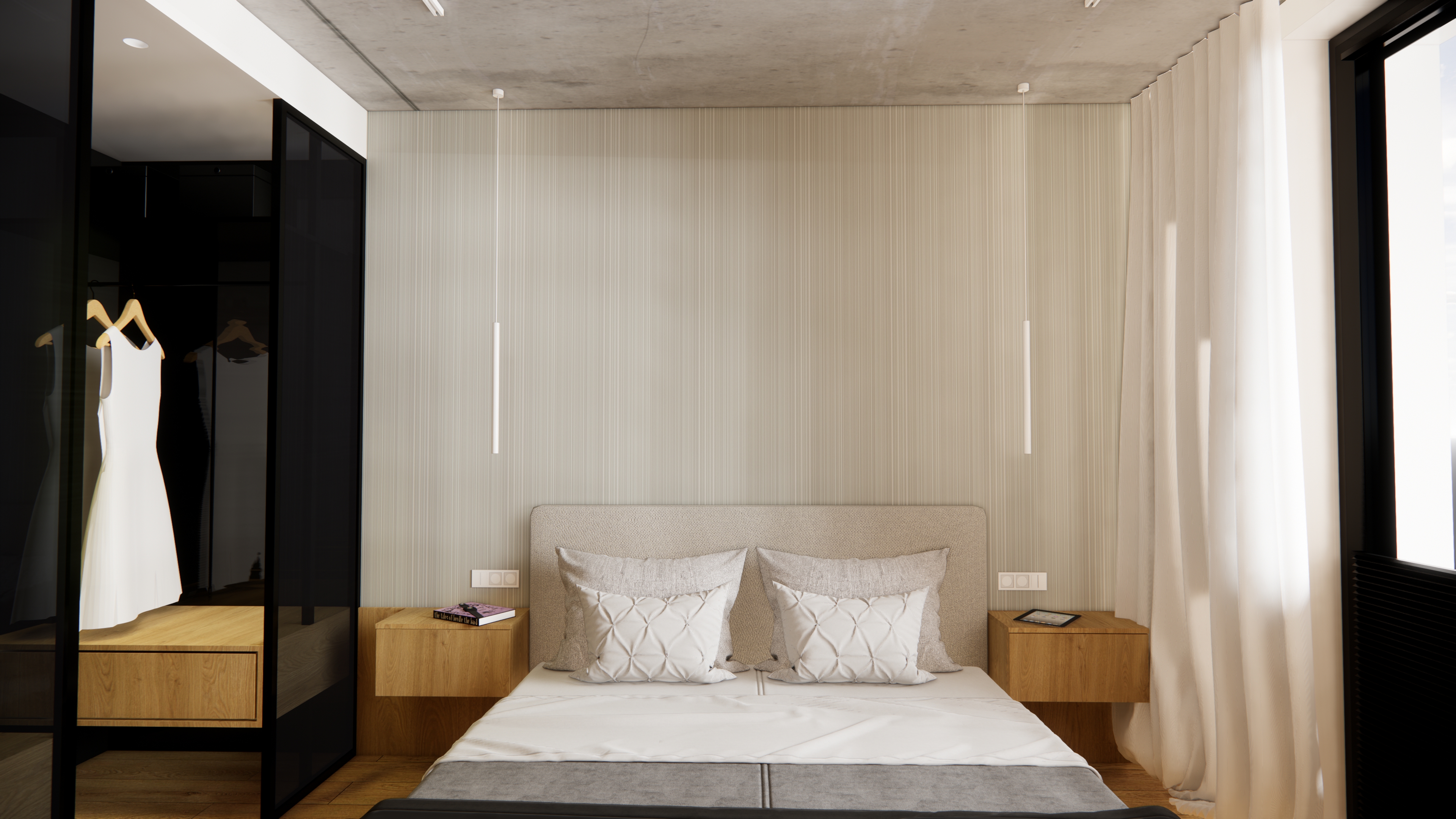 create a photorealistic image add lighting replace materials with photorealistic real materials add reflections and shines to materials insert an ies light cast replace soft materials and cloths for high end real like materials add a person to the image girl in a white short dress sitting on a bed slightly motion blurred as a long exposure