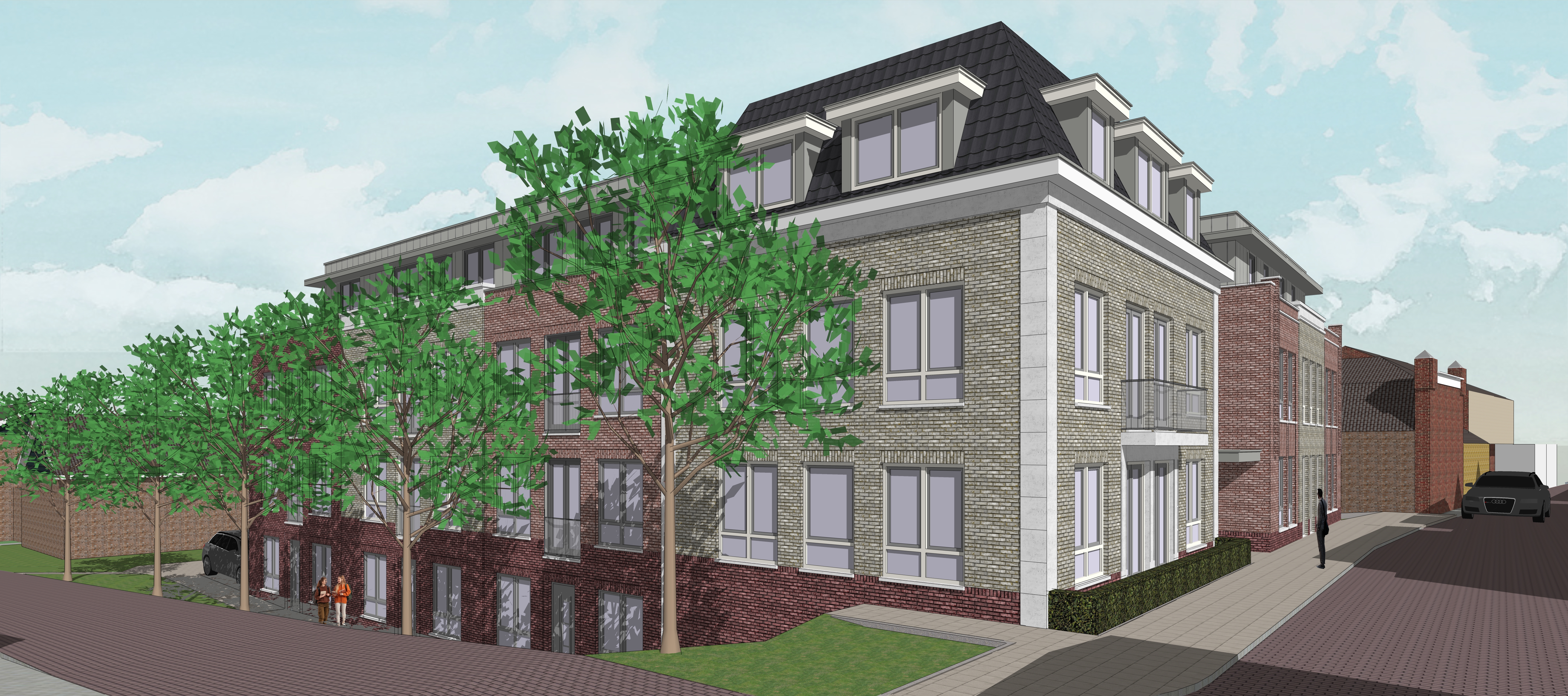 add curtrains behind the windows change trees for oak trees point sun on other facade