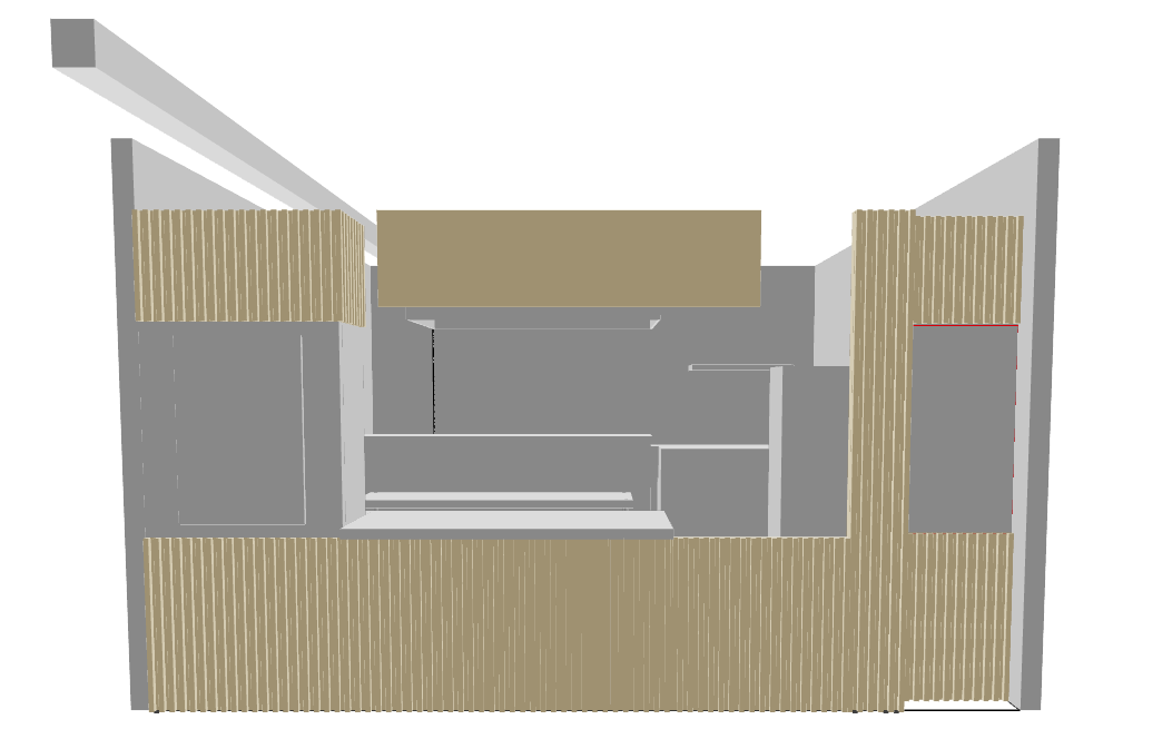 design a modern food stall exterior within a continuous indoor food hall where stalls are directly adjacent to one another with no gaps or walkways between them the stall front features light colored vertical wood slats e g white oak or maple tone the slats extend upward but stop below an act acoustic drop ceiling maintaining an open gap above near the top of the fa ade include a horizontal protrusion bulkhead element that represents a concealed structural i beam between the stall and ceiling this feature should feel intentional and integrated into the design the left and right side wall areas are solid and intentionally blank not cutouts or openings these surfaces along with any non wood portions of the fa ade are finished in smooth white gypsum board white gyp to create a clean minimal contrast with the wood slats provide a service opening with a clean counter and include visible front facing equipment e g undercounter refrigeration prep surfaces arranged neatly and minimally do not include menu boards the mass directly above the counter should remain intentionally blank designed as a dedicated zone for a future hanging sign with no graphics or fixtures applied lighting should be warm and subtle integrated into the stall such as linear lighting or small downlights to highlight the wood texture and service area without clutter the stall should read as modern clean and warm standing out while still fitting cohesively within a tightly packed row of neighboring stalls with varying designs