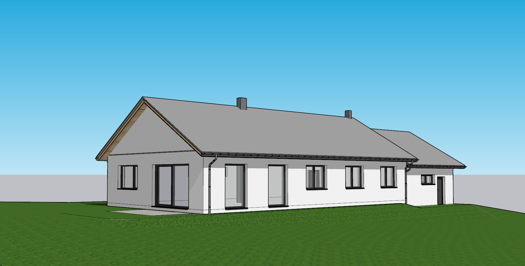 a flat grey roof tile laid in a staggered pattern white plaster on the walls a thin grey horizontal strip on the gable wall anthracite coloured window and door joinery a chimney covered with grey seam sheet metal low bushes around the house a sunny sky a light wood soffit lamps in the soffit curtains on the windows children playing a paved terrace a garden sofa and a barbecue on the terrace