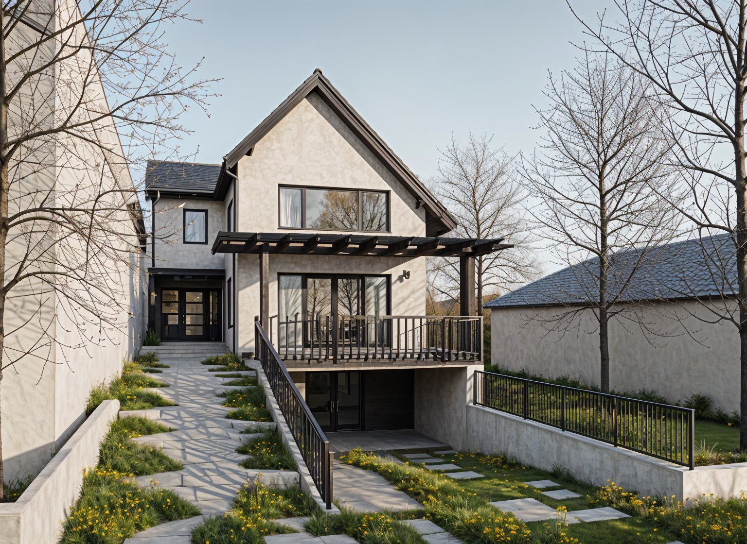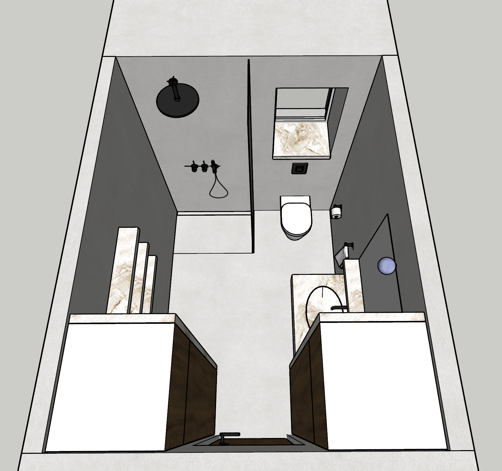 photorealistic image minimalistic bathroom walls door and floor from light white beige microcement washbasin from marble panels left and right from the same marble like the washbasin