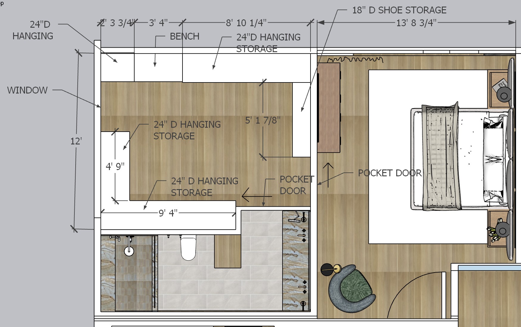recreate this photorealistic rendering of this overhead view of this master suite with walk in closet master bedroom and master bath keep light oak floors