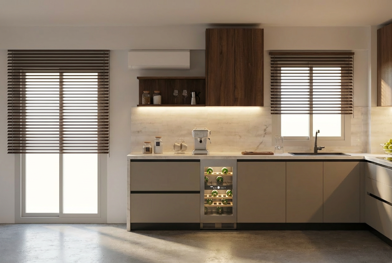 primary reference black and white floor plan this image defines the layout and must be followed exactly secondary reference furnished interior images these define only the style lighting and materials not the layout task create a realistic interior view of this apartment from eye level critical rules follow the floor plan exactly wall positions room connections proportions do not redesign expand or simplify the layout do not create a dollhouse cutaway or top down view keep the apartment compact and realistic in size style bright neutral daylight no yellow amber cast soft modern senior living style light wood tones warm neutrals soft textiles clean inviting not overly staged composition eye level camera 5 ft show depth between living space and bedroom natural believable furniture placement based on room size priority 1 layout accuracy floor plan 2 realistic proportions 3 style application