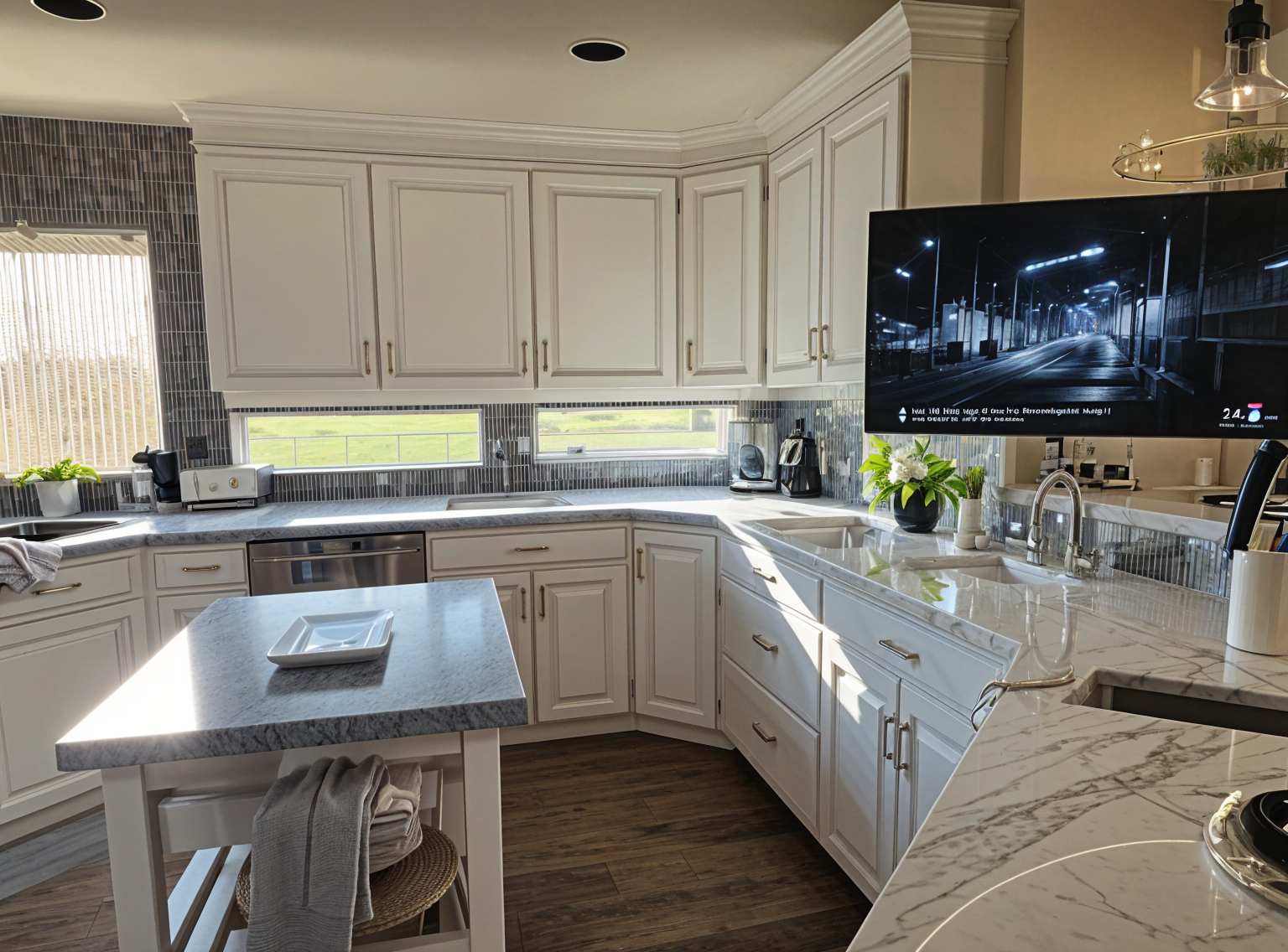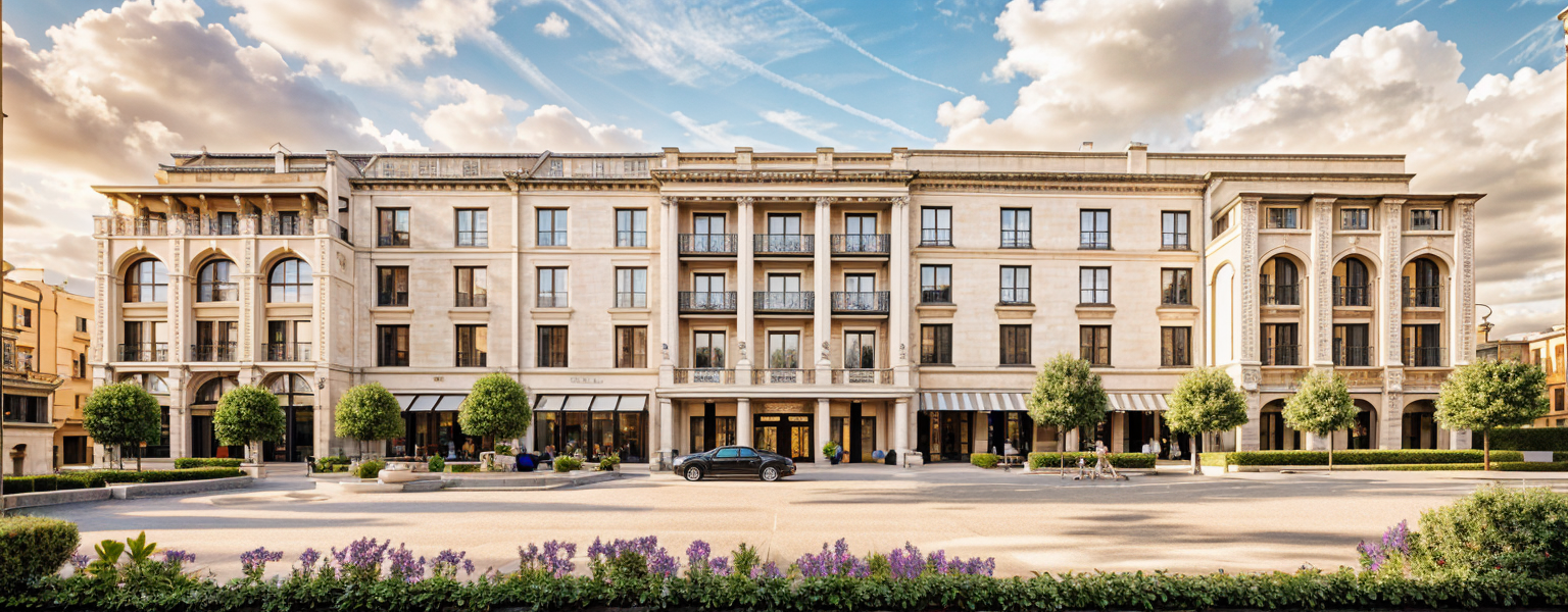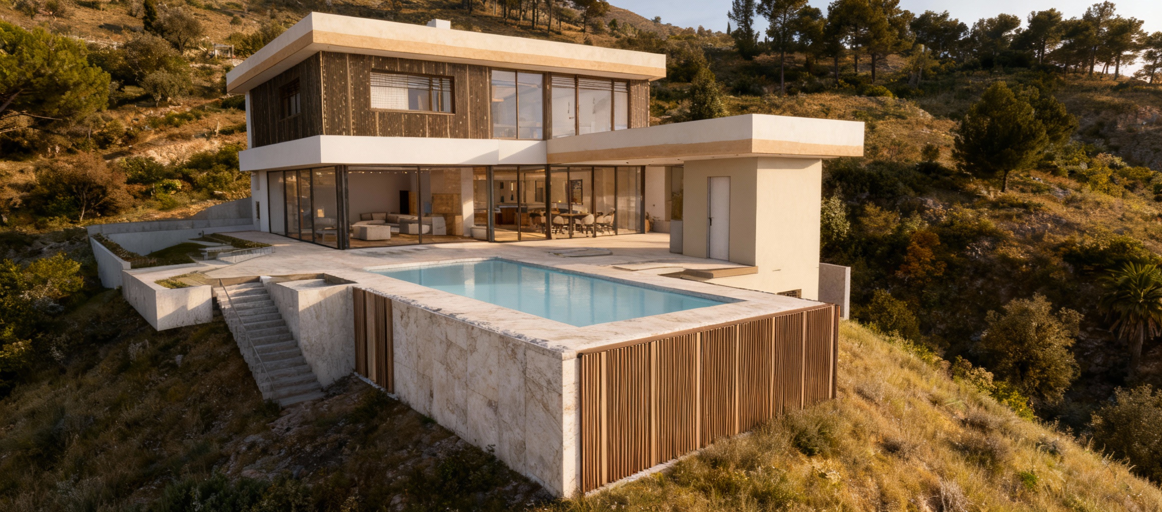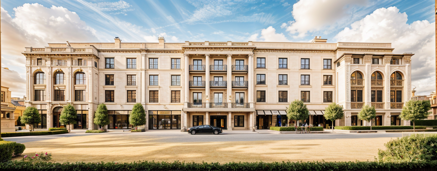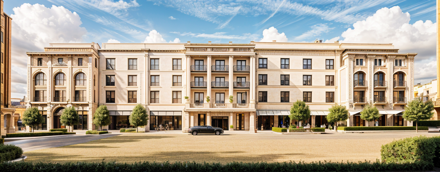 exterior shot create a beautifully modern bathroom scene with a minimalist design the walls should be textured in light grey marble the floor and ceiling in a darker shade of grey for contrast include a sleek black showerhead and fixtures adding a touch of elegance incorporate white elements for the toilet and sink enhancing the cleanliness and simplicity the open shelving should be white holding folded grey towels neatly hanging clothes in shades of white and dark grey and a stylish black bag add a black round mirror above the sink the atmosphere should be serene contemporary and sophisticated emphasizing a balance of cool tones and modern design elements