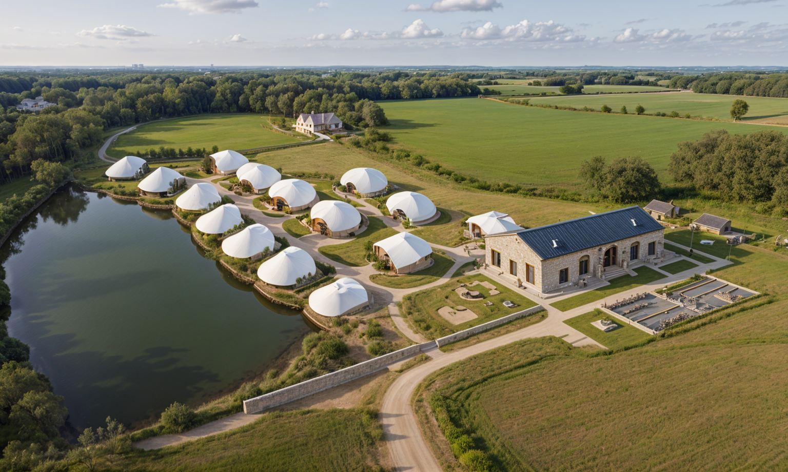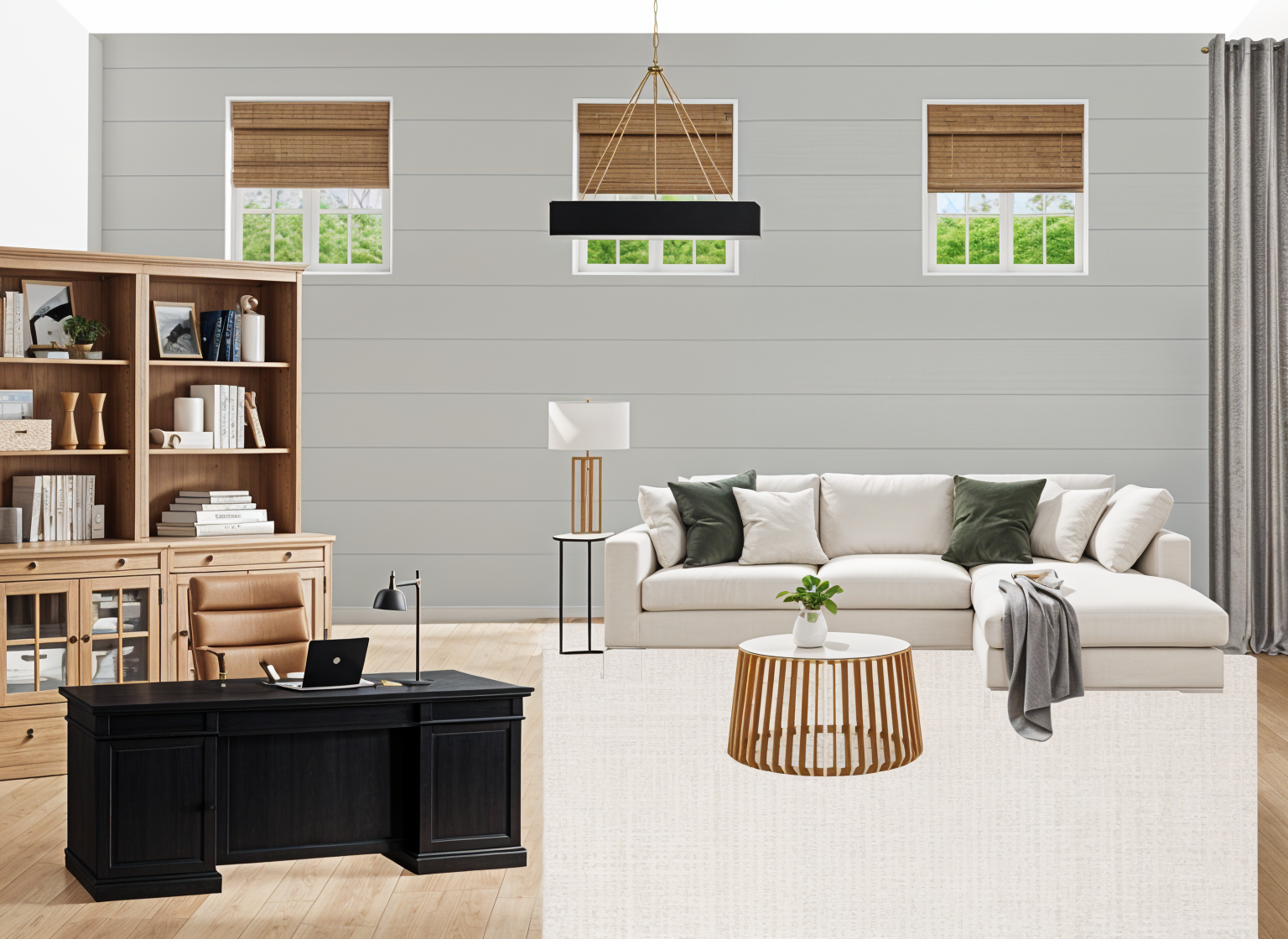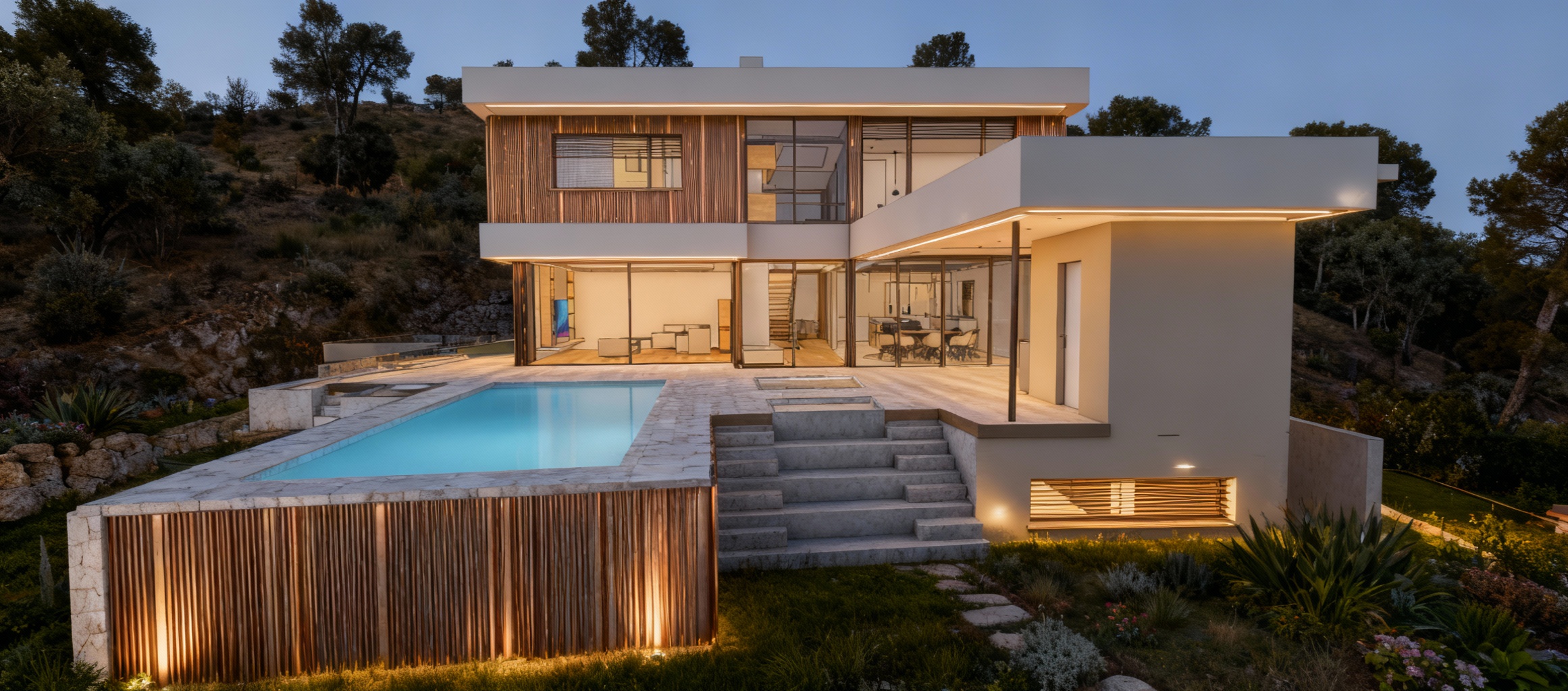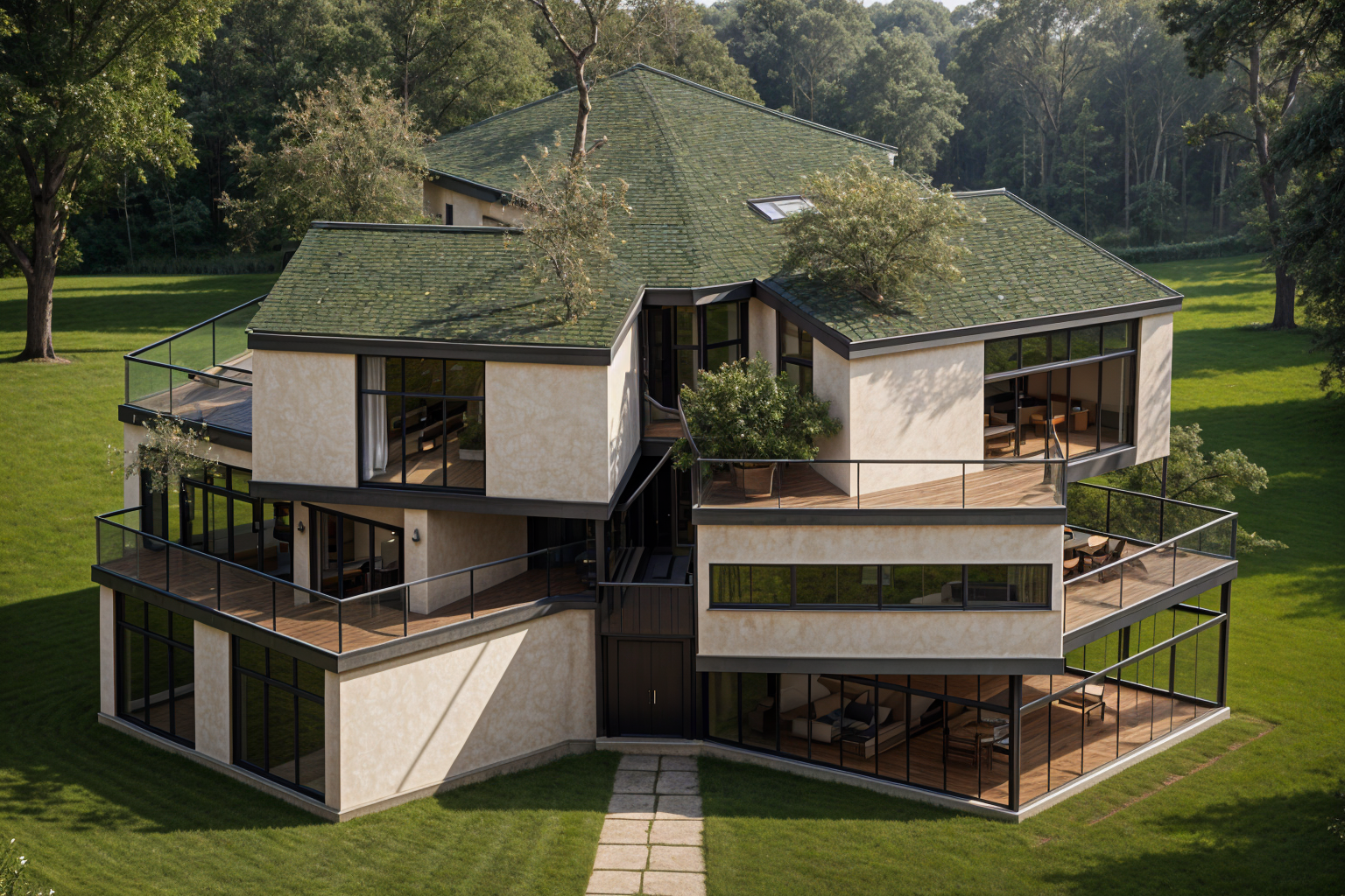 exterior shot create a beautifully modern bathroom scene with a minimalist design the walls should be textured in light grey marble the floor and ceiling in a darker shade of grey for contrast include a sleek black showerhead and fixtures adding a touch of elegance incorporate white elements for the toilet and sink enhancing the cleanliness and simplicity the open shelving should be white holding folded grey towels neatly hanging clothes in shades of white and dark grey and a stylish black bag add a black round mirror above the sink the atmosphere should be serene contemporary and sophisticated emphasizing a balance of cool tones and modern design elements