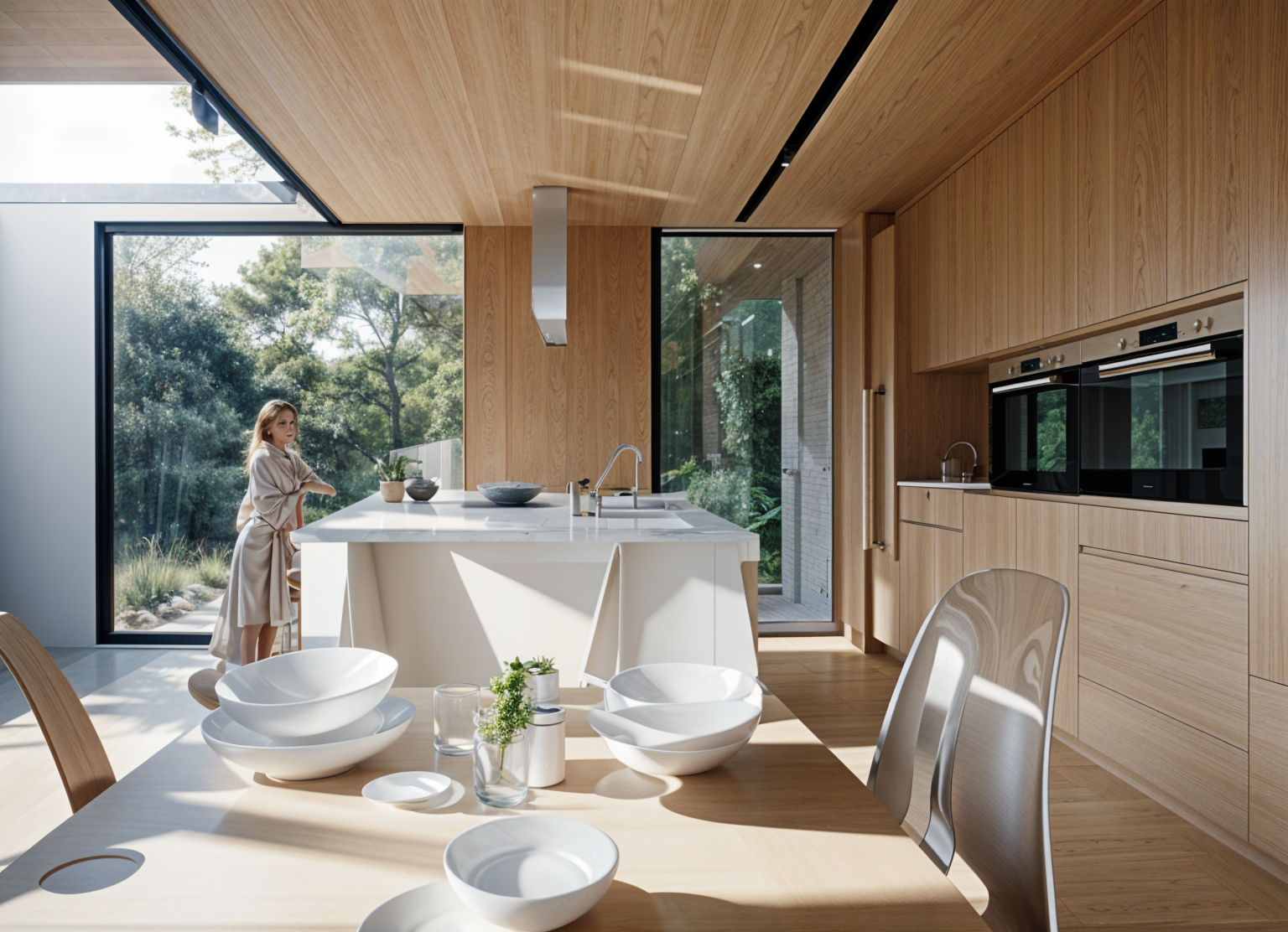 modern elegant living room on the left side there is a dining area the kitchen is located in the middle at the back on the right side there is a modern living room setup