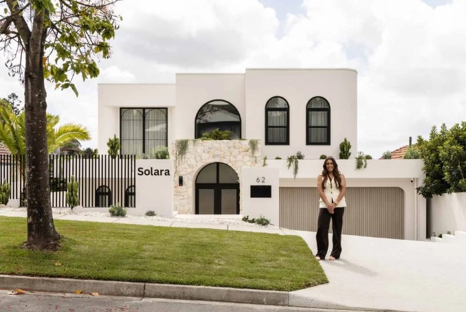 exterior shot keeping the exact design and proportions from the original style the building in a modern mediterranean look with white plaster walls black joinery glass balustrades with a simple single steel handrail and balusters include a grass bank in the foreground render the final image as a coloured pencil sketch with soft textures and hand drawn qualities