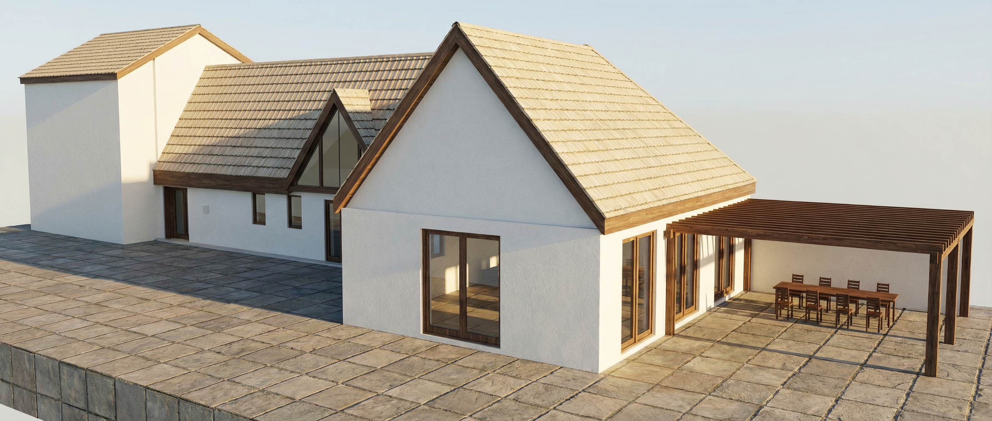 the building facade is in white painted bricks the roof is in dark grey tiles the wall sconces are lit up ths swimming pool mosaic is light blue the deckchairs are white the terrasse floor is in light beige stone large tiles the windows reflect a counry side environment the parasol is in dark grey fabric the hedges aroound the pool are natural vegetation with some small branches sticking out of the general shape