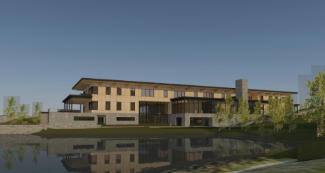 render a photorealistic 3d perspective of this golf clubhouse in big sky montana reference the current material style just enhance them dark metal roof vertical wood siding concrete walls keep model geometry the same windows doors roof walls garage door pavement driveway make a lush vegetation that looks native to big sky montana do not change the view only enhance the current materials and make the landscape nicer vegetation detailed textures in the wood siding and glass reflections and a vibrant clear sky with light atmospheric depth render in hyper realistic architectural visualization quality 8k resolution
