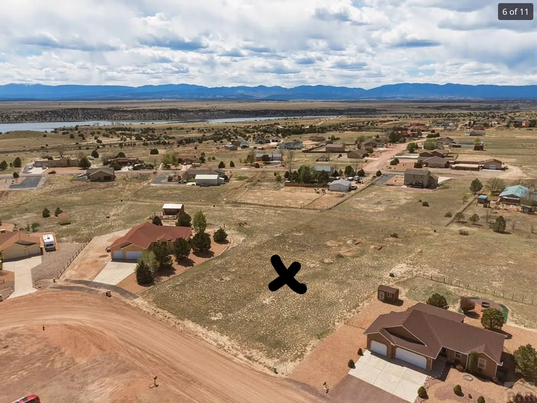 add single story ranch home stucco grey black asphalt shingle roof black windows gable front wood porch single story driveway to street place the home on the empty lot between the two homes where the black x is make the home seperate from the existing homes with red roofs