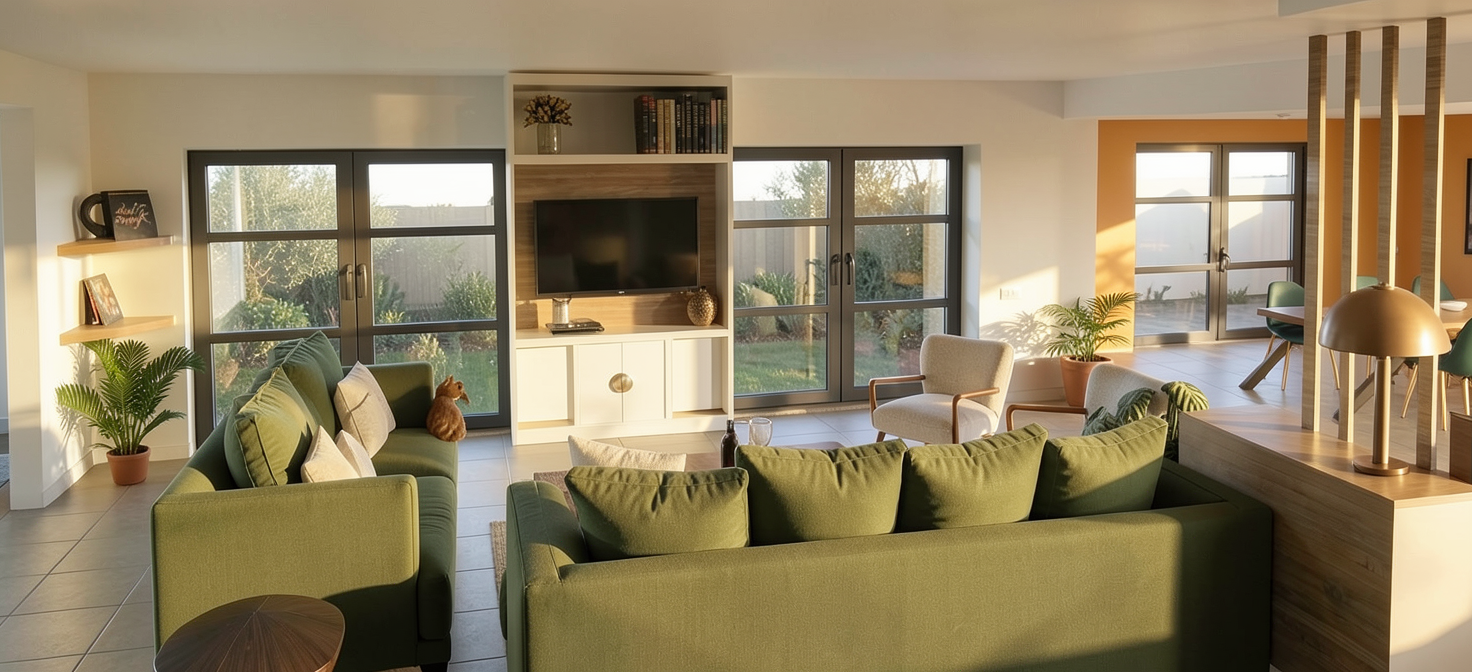 create a render in hyper realistic architectural visualization quality 8k resolution all objects furniture and architectural features must remain in place do not add any objects or delete anything from the image the spatial configuration must remain unchanged warmth gentle reflections soft shadows enhanced color richness and luxurious level realism improve depth and realism through wood grain richness highlights fabric texture and soft blue color clarity while keeping the entire scene exactly as originally designed use warm light 2700 k from pendant lights use general sunset light lighting in the room use a smooth white wall surface add exterior landscape like a building backyard in an italian style