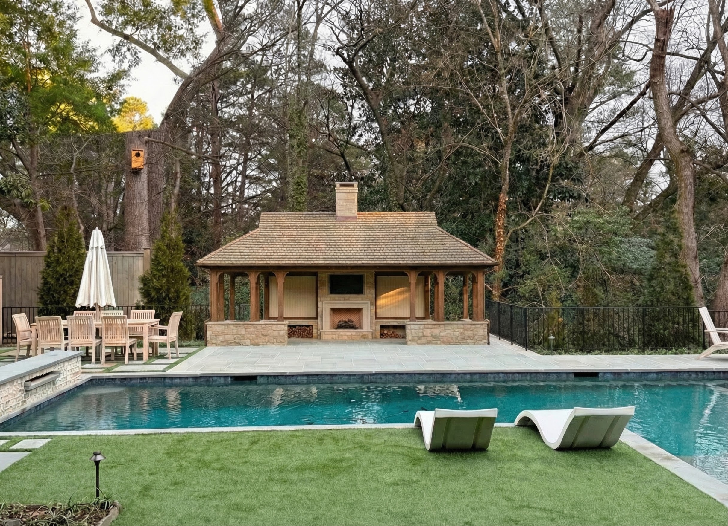 use the current image as the base scene keep the pool patio dining area on the left lawn trees fencing and overall materials exactly as shown modify the cabana structure only as follows 1 increase the width of the cabana on the right hand side only extend the right side of the structure fully to the black railing shown on the right side of the patio the cabana should now span from its existing left edge to the railing on the right 2 modify the railing so it sits on top of the extended stone knee wall of the cabana along that right side the railing should integrate naturally with the stone base 3 increase the front to back depth by sliding the cabana forward toward the pool the front face of the cabana should align with the row of dining chairs closest to the pool the chairs around the table on the left side 4 maintain the same architectural style roof pitch shake style roofing chimney fireplace placement wood posts and stone base but scale proportionally to support the new width and depth this is a proportional adjustment only do not redesign the cabana do not change materials do not alter the pool or patio layout ensure proper ground contact and realistic shadowing high resolution photorealistic rendering