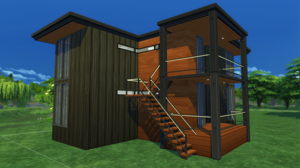 the exterior of the home is in a black vertical board and batten style siding the home is surrounded by spruce and pine trees add golden hour lighting