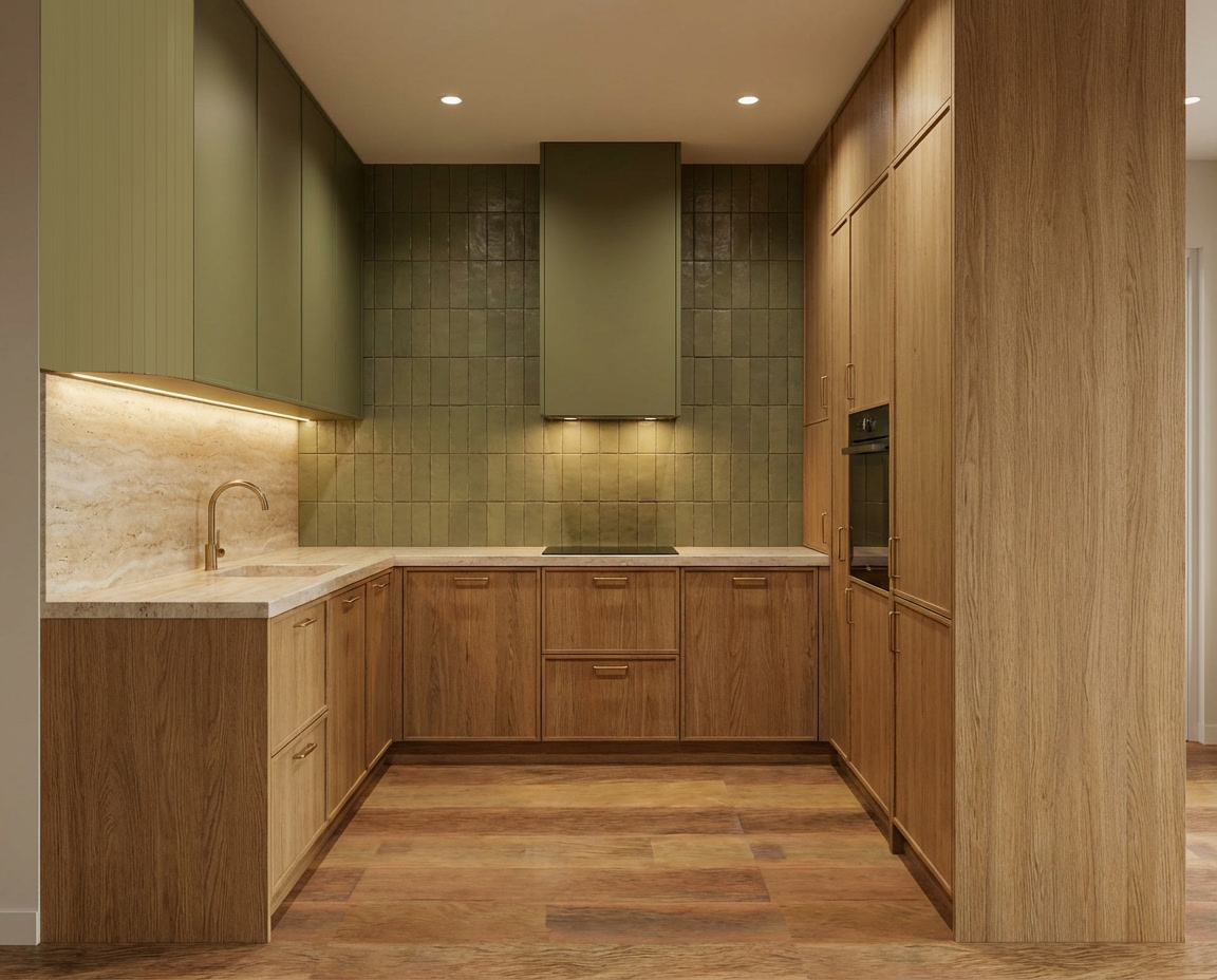 put one wood shelf under the upper cabinets remove the handles use travertine in the front backsplash and remove the shelf above the stove