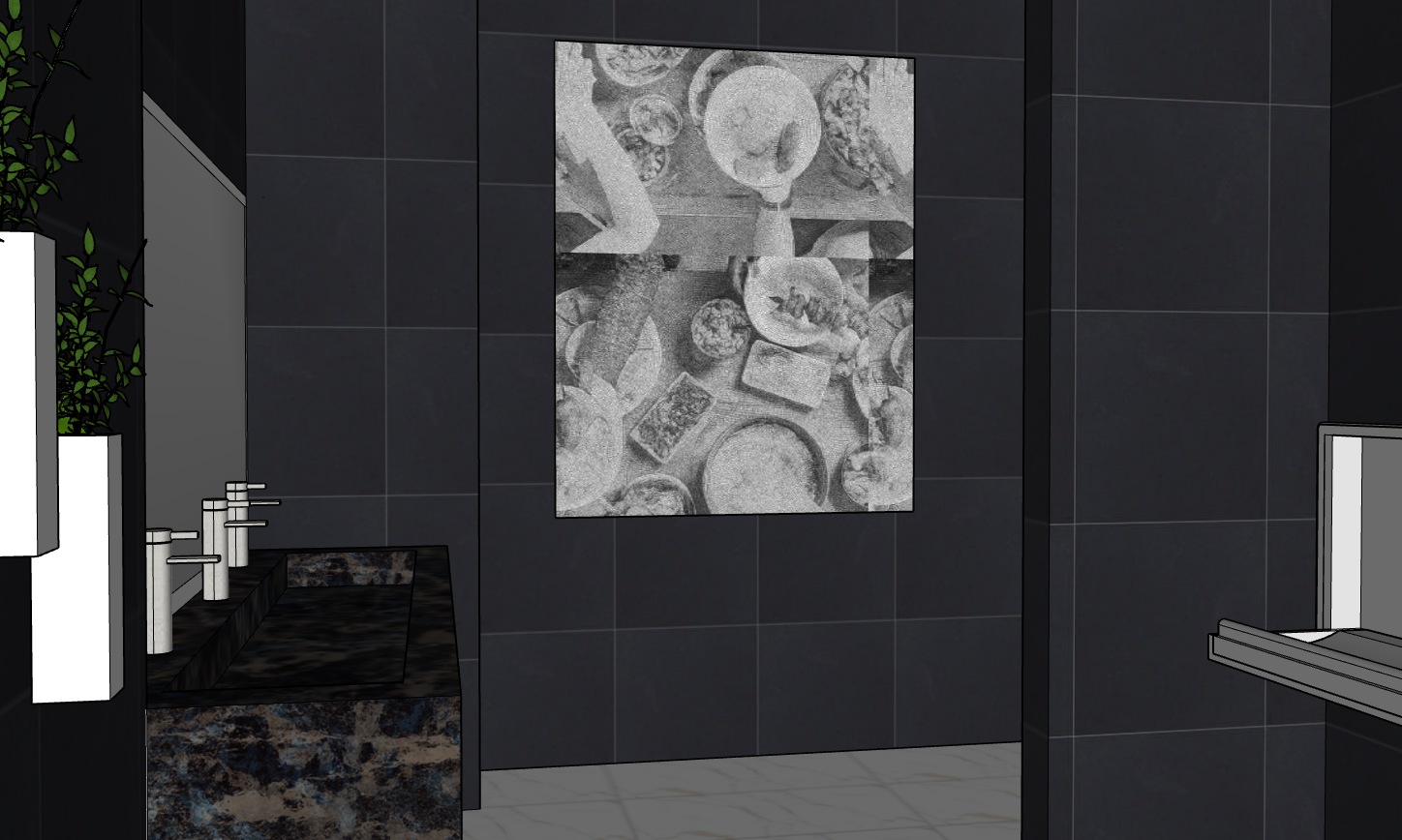 generate a hyperrealistic high resolution 8k architectural render of a sleek modern washroom interior captured in a medium eye level shot focused on a double vanity setup the walls must be clad in large format matte black porcelain tiles creating a dramatic dark backdrop for the central feature a large framed black and white mosaic artwork depicting a detailed still life that is intensely backlit with a soft white led strip causing a distinct reflective halo effect on the surrounding dark tiles the foreground features a double vanity with two sharp white ceramic sinks resting on a polished dark blue black granite countertop with prominent white veining all illuminated with dramatic contrast lighting and accented by modern chrome fixtures and a touch of green foliage visible on the far left