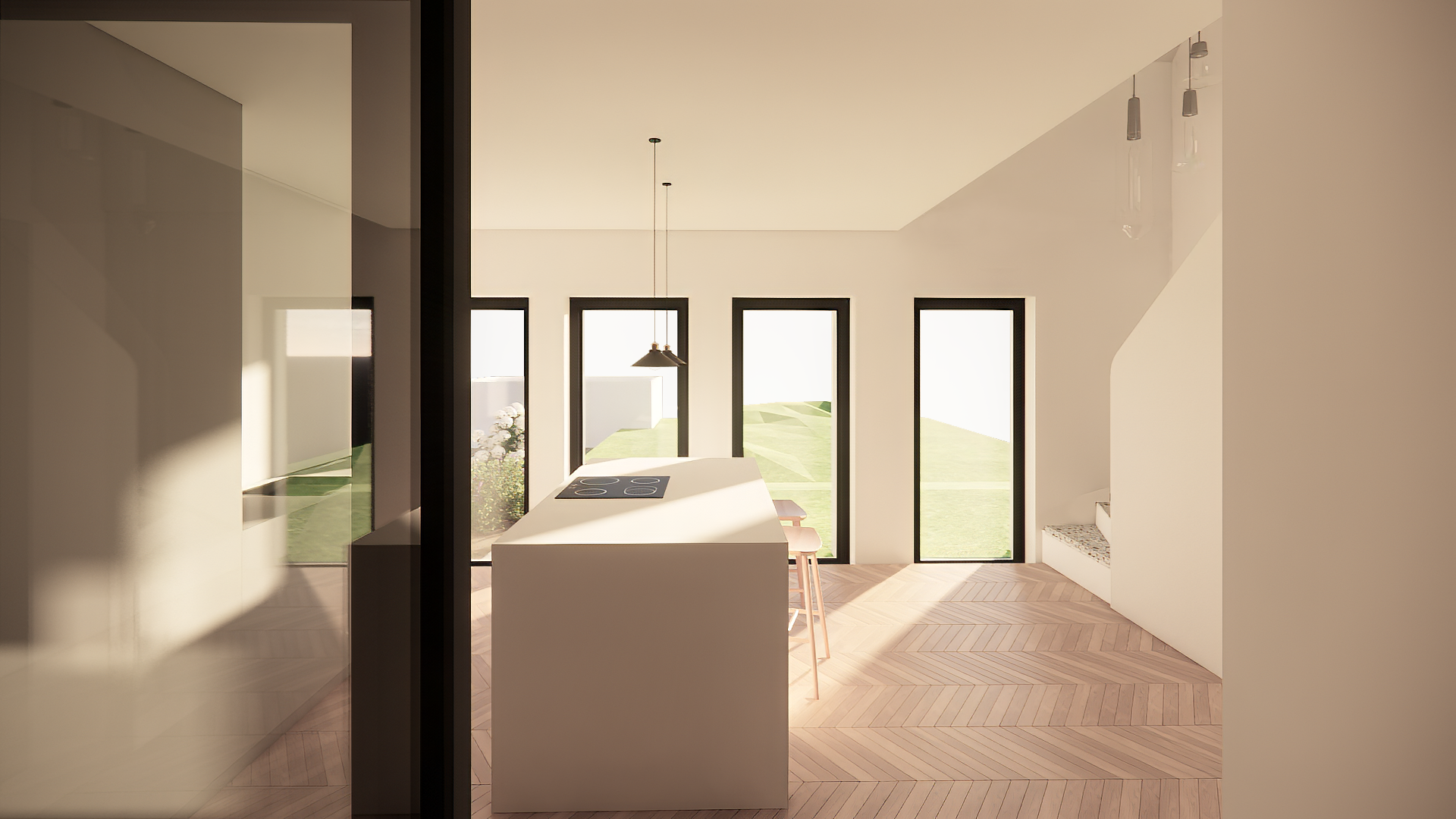 modernist exterior shot a calm and warm interior transformation within an existing old house preserve the original architecture proportions geometry and all openings exactly as in the input image do not alter walls windows or layout create a quiet minimal and atmospheric space with a strong architectural presence avoid any staged decorative or overly styled appearance use natural warm materials such as wood lime plaster and matte surfaces the color palette should remain restrained warm whites soft beige muted earth tones surfaces should feel slightly imperfect and authentic not new or glossy introduce subtle aging and depth through materiality not through objects keep the space intentionally sparse avoid excessive furniture decoration textiles or accessories no visible styling elements lighting should be soft natural daylight with gentle shadows creating a calm and grounded atmosphere outside show a natural slightly wild garden with informal planting and soft greenery avoid manicured or designed landscaping add a soft natural sky the overall feeling should be warm quiet and understated architectural not decorative plain construction joints no lighting features at transitions architecture