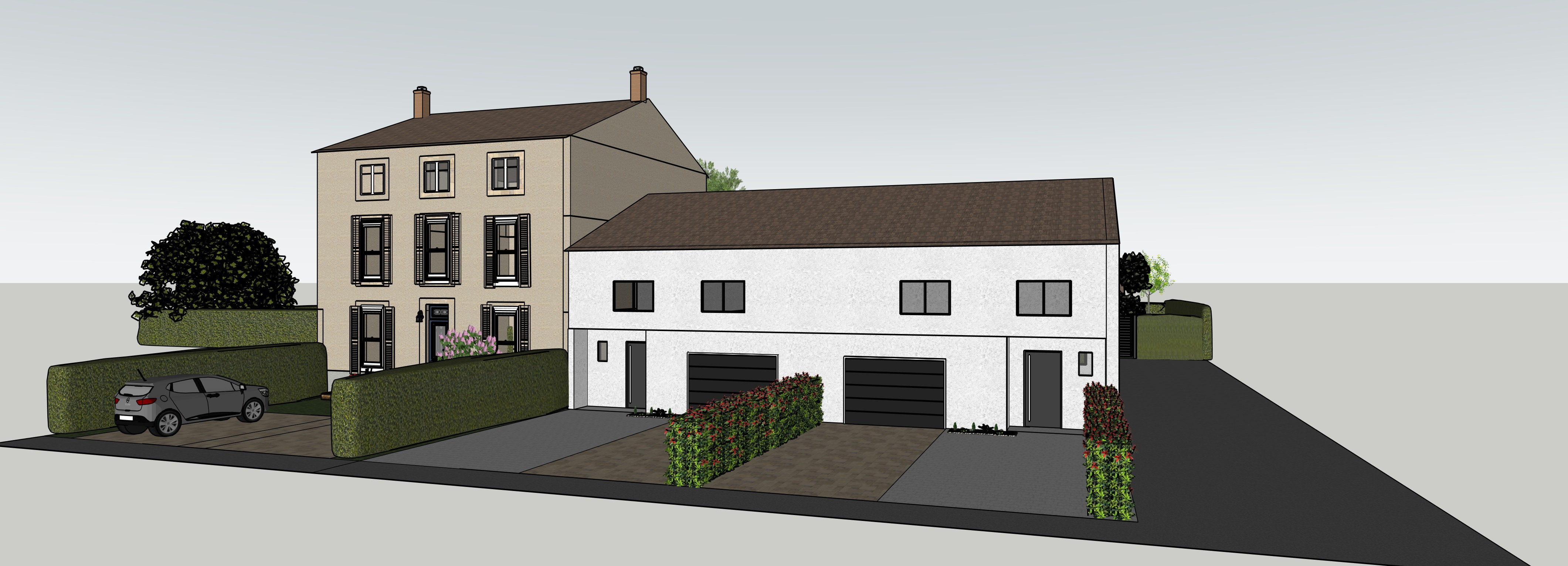 the tiles of the houses are reddish natural daylight the houses are facing the north respect color and geometry the two houses from the right side are white