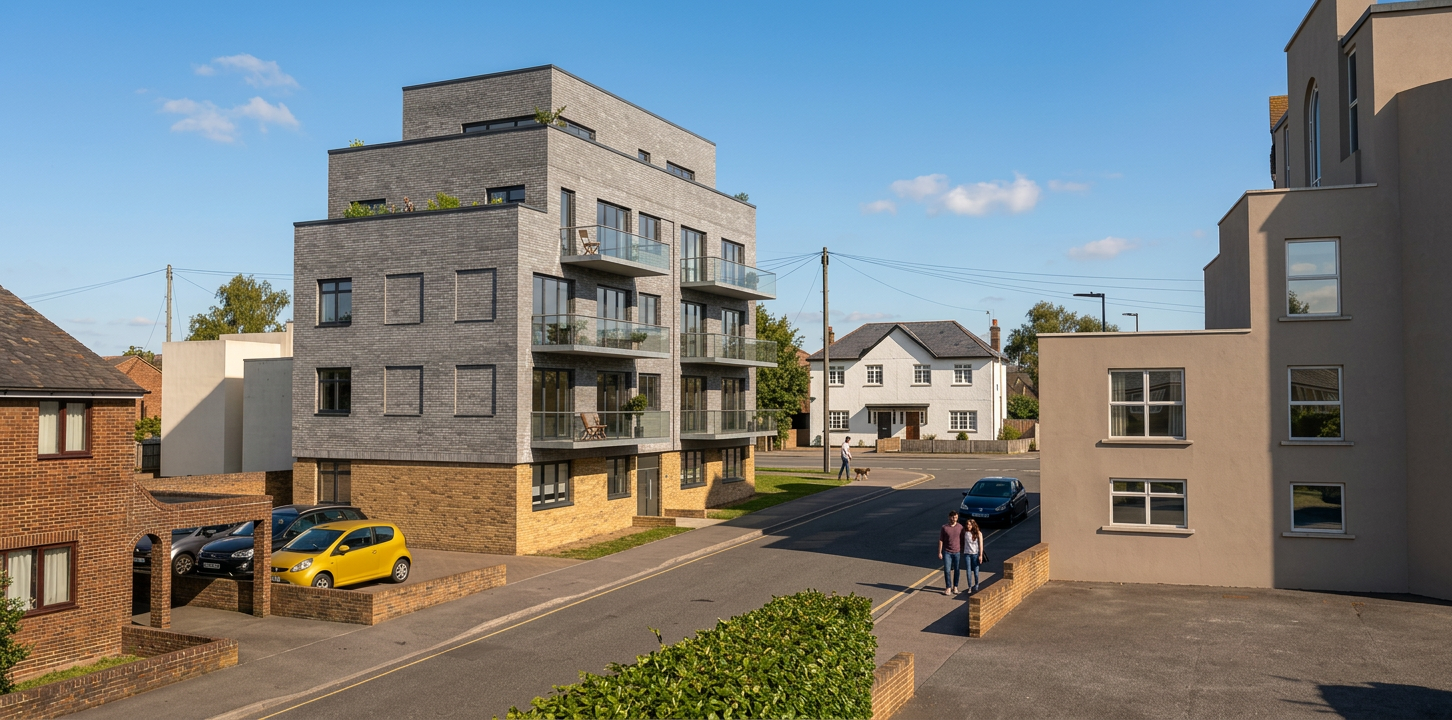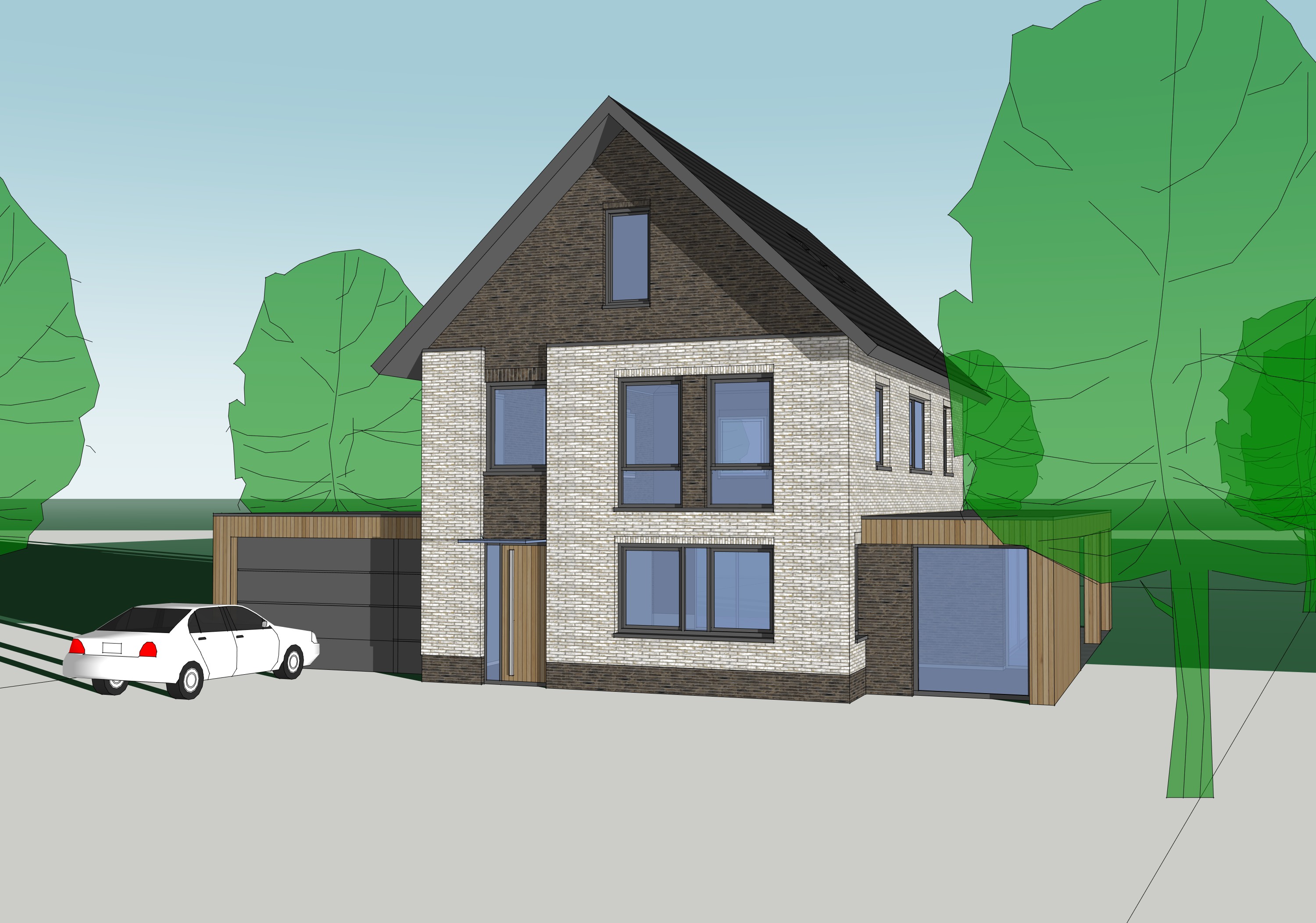 add trees bushes and flowers and some people around the house and in the garden the weather is sunny with a few clouds keep the materials and clours of the house exactly the same as in the original only the driveway is paved with bricks the rest is garden and is green and lush make the car more real the sun illuminates the front facade and makes the picture feel warm and nice