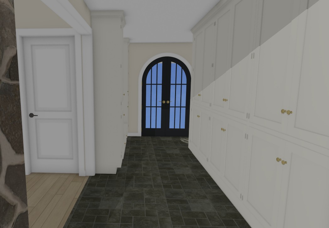 mudroom with cabinetry to the right cabinetry is a soft white with oval brass hardware the floor is slate there is a stone opening in the immediate left foreground at the end of the hallway is an arched black steel door through the glass you can see many trees picture is 8k and hyperrealistic