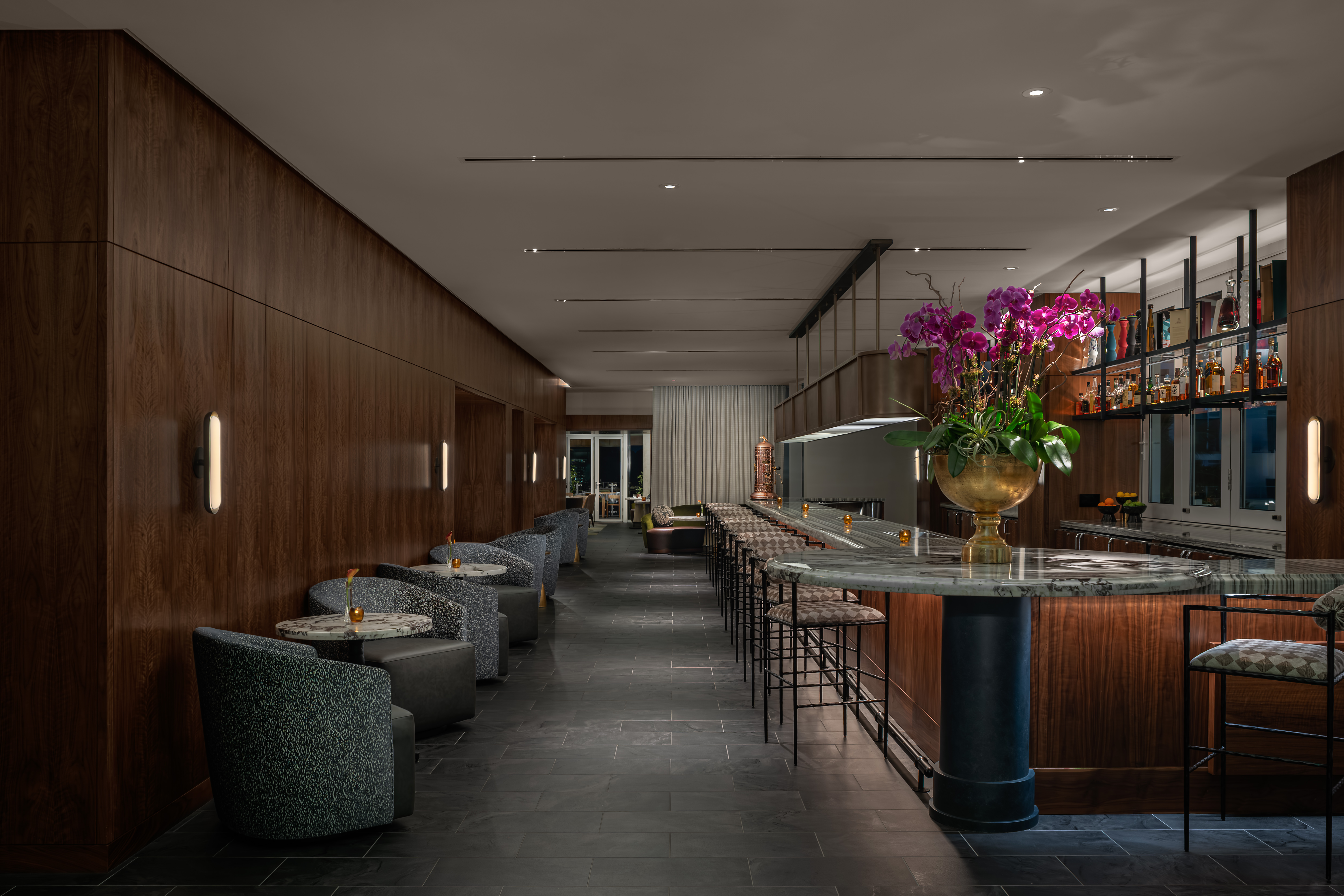 improve lighting to be warmer add people dressed in nice clothes maintain architecture and materiality
