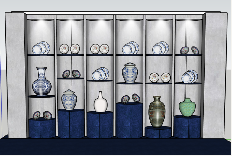 shelves made of concrete with blue velvet as the podiums displays ceramic items and have light to highlight the objects