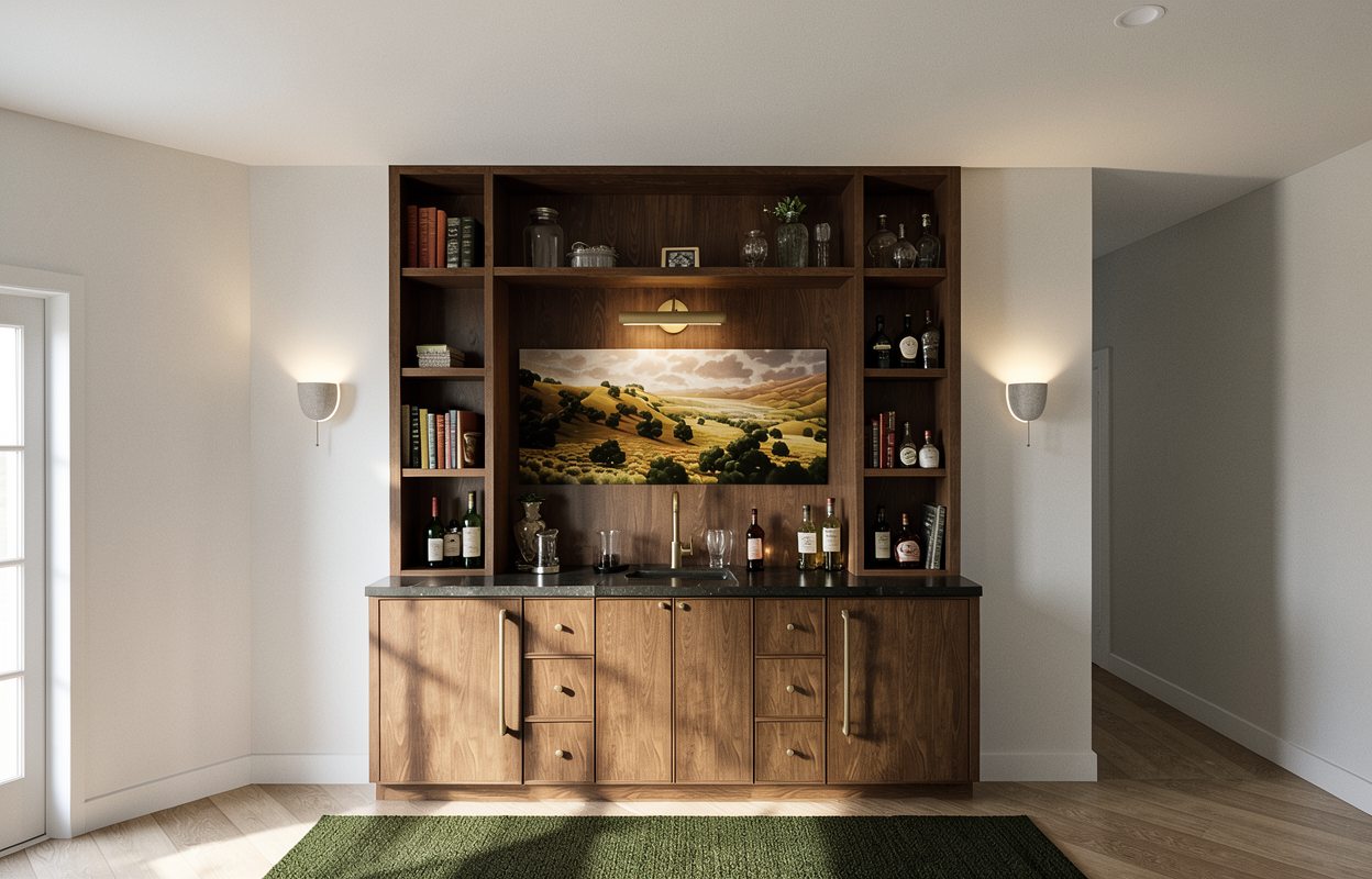 change the time of day to dusk add chaise lounges and bring the lounge away from the cabinets and close to the camera lens keep everything else in the scene the same especially the french door divided lites and the colors of the painting make the 2 lounges interior elegant moody lounge chairs keep the colors of the painting the same as the original photo remove the floor lamp in the hallway and keep the hallway open and bare like the original photo keep the wall sconces the same as the original photo