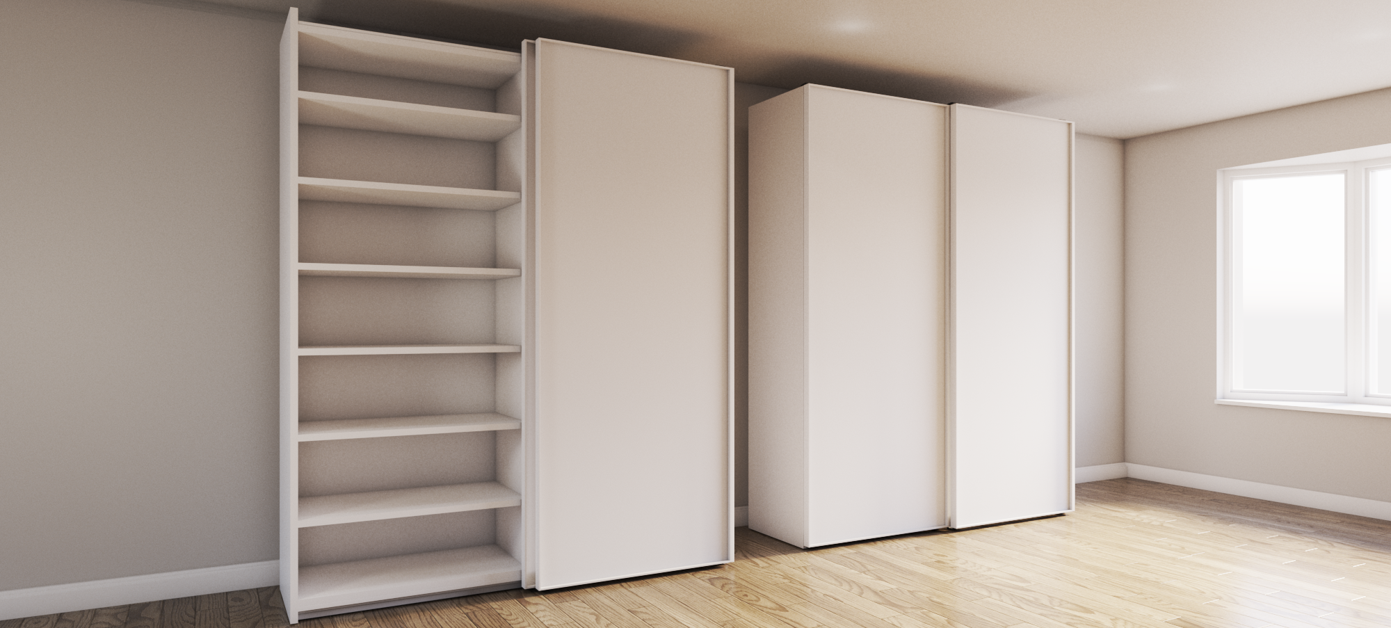 a modern wardrobe with open shelves next to sleek sliding doors the wardrobe is matte white and the front doors are made with back painted white frosted doors set against light beige walls the floor is polished natural wood adding warmth the atmosphere is serene and minimalist with soft diffused lighting illuminating the room gently