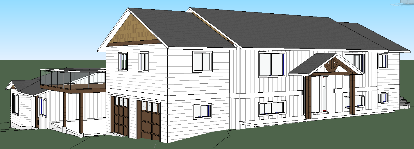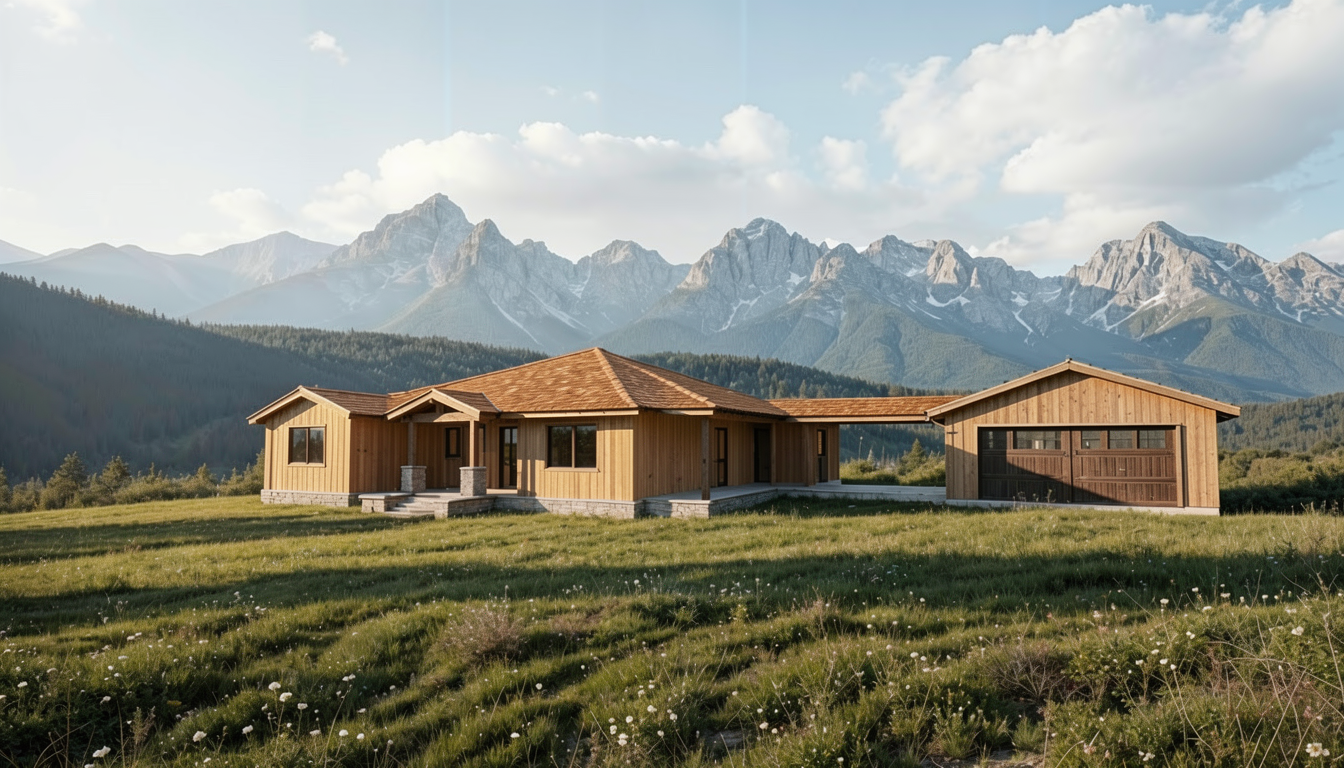 add natural lighting make look realistic add a concrete driveway to the garage doors and the carport coming from the left there is a lane on the left of the building add landscaping and surrounding trees there is a far away ocean view