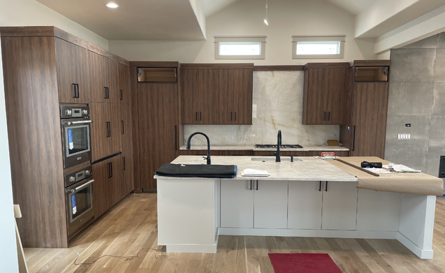 do not change the cabinets in any way preserve the exact cabinet colors materials finishes dimensions door and drawer styles hardware spacing alignment and all geometry exactly as shown do not alter the countertop shape backsplash appliances flooring lighting fixtures or wall structure only remove the construction materials clutter and mess from the scene clean the room and make it look finished and staged add a few simple tasteful home accessories appropriate for the style of the space but do not add or remove any furniture windows or architectural elements maintain the original lighting direction and realism enhance clarity and polish the photo while keeping the cabinetry and room design completely unchanged do not alter the lighting to keep the cabinet colors as they are in the image add doors to the open black cabinet boxes add a hood over the cooktop add stools below the island overhang