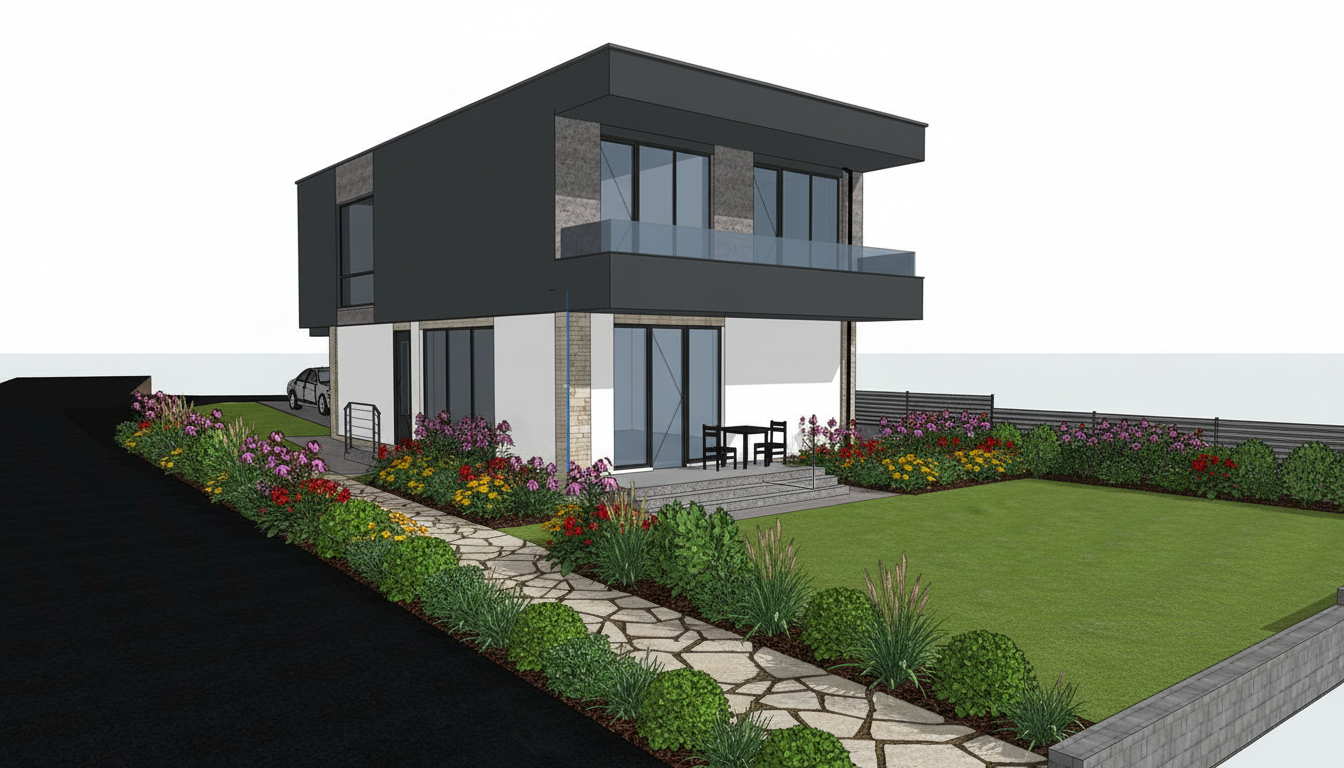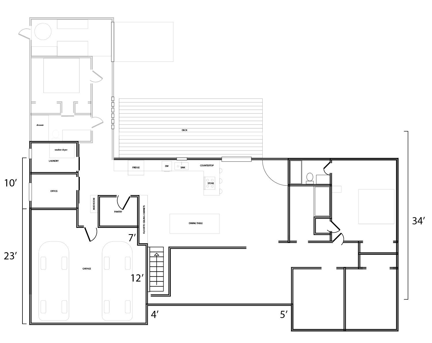 convert this floor plan into a realistic isometric 3d view of a full house show the space from an elevated angle with furniture walls and details visible the walls are 8 high the flooring is light sandal wood plank placed parallel with the counter tops the counter top should be white marble the counter top is along the wall with the window and forms an l shape with a stove in the l turn we want the cabinets to be a medium wood and modern the window above the sink is apx 3 x 3 use the same furniture as shows on the plan do not change the orientation of the floorplan
