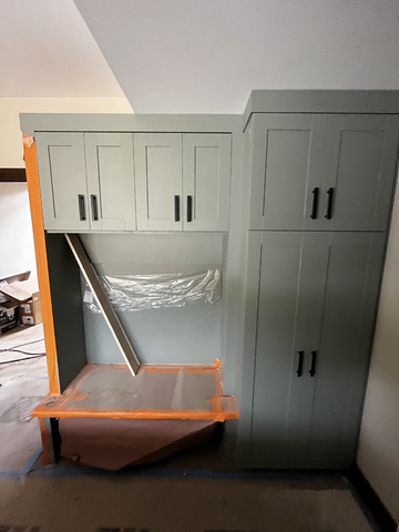 do not change the cabinets in any way preserve the exact cabinet colors materials finishes dimensions door and drawer styles hardware spacing alignment and all geometry exactly as shown do not alter the countertop shape backsplash appliances flooring lighting fixtures or wall structure only remove the construction materials clutter and mess from the scene clean the room and make it look finished and staged add a few simple tasteful home accessories appropriate for the style of the space but do not add or remove any furniture windows or architectural elements maintain the original lighting direction and realism enhance clarity and polish the photo while keeping the cabinetry and room design completely unchanged do not alter the lighting to keep the cabinet colors as they are in the image stage for a mudroom bench