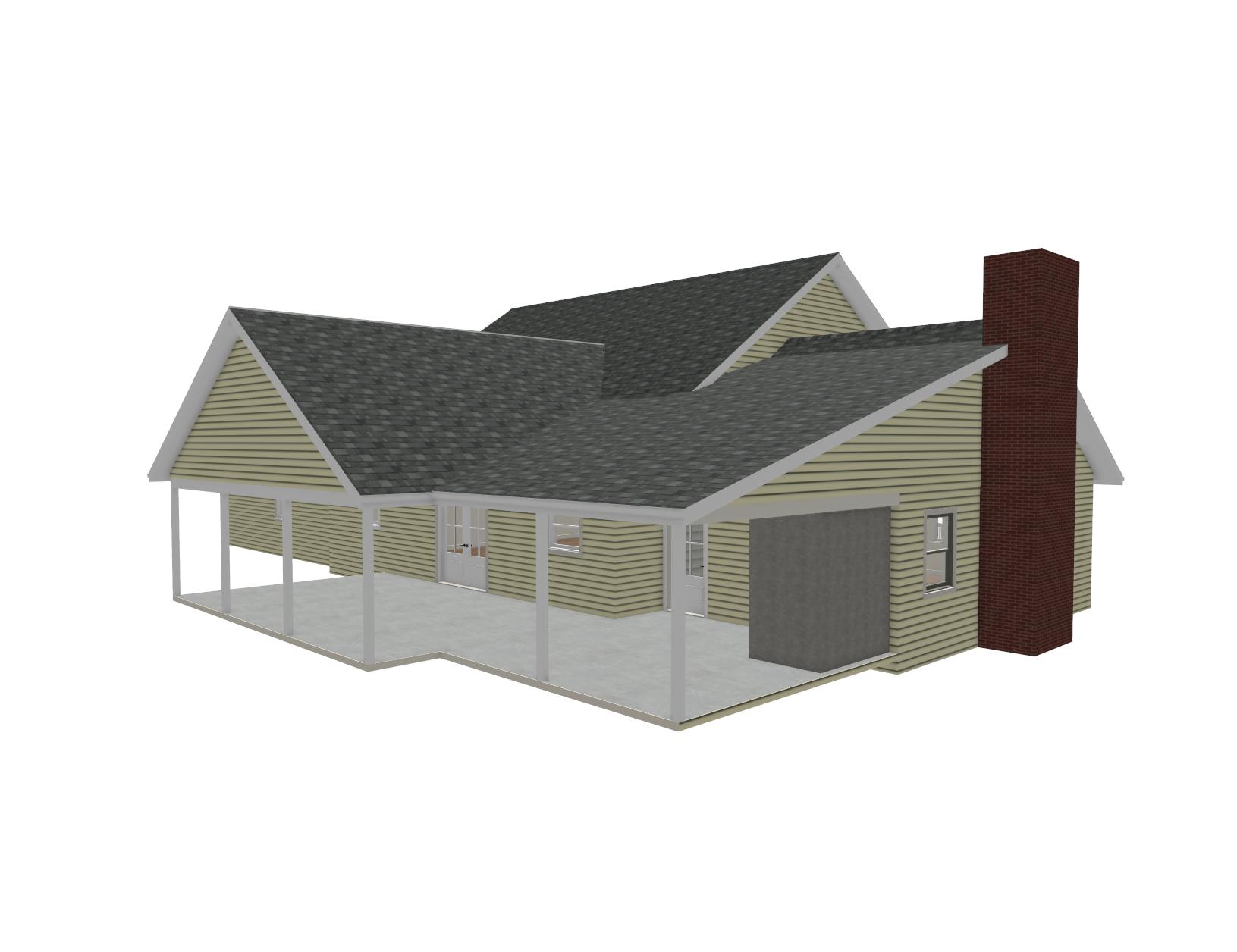 3d render this photo with the following details roofing is black shingles siding is cream colored vinyl siding double all windows and doors are white on the back gable of porch remove the vinyl siding and add a cedar truss all porch posts are wood tone color between the porch post show horizontal cable railing with a white top and bottom railing add vinyl siding to cover all sides of the gray area on the right side of deck add a well manicured lawn and some basic landscaping with flowers