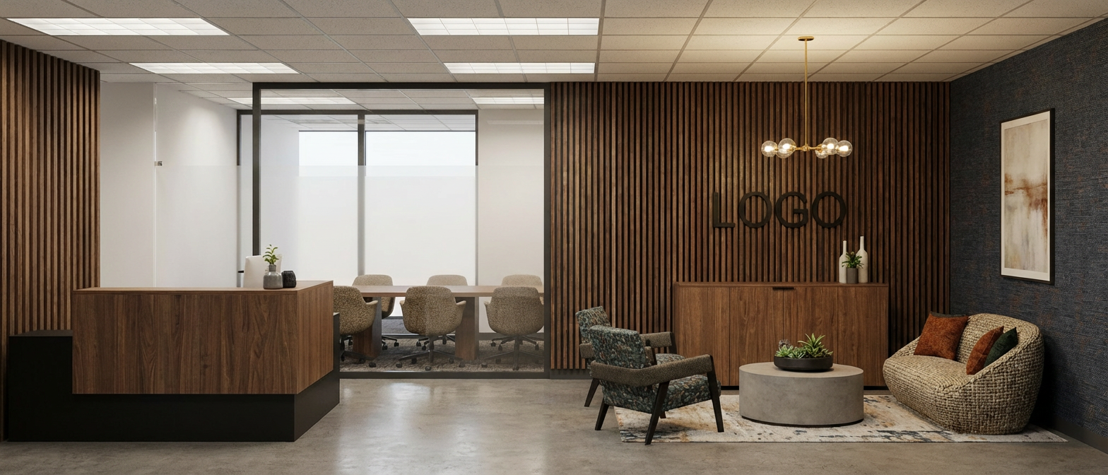 enhanced interior lighting white quartz slab countertop same white quartz slab 6 inch backsplash same white quartz slab shower wall and tub deck two porcelain undermount sinks brass deck mount faucets undermount tub in tub deck beyond shower small mosaic limestone tile on floor natural wood white oak simple cabinetry with brass hardware tan plaster on walls wood trim around opening on left with large wood header full width mirror above sinks 3 evenly distributed skinny cylinder frosted glass sconces with one of them centered in ceiling lights in soffit above sinks soft accent lighting underneath the mirror natural medium brown wood tall baseboard natural medium brown wood window trim and window cladding loveseat short sofa beneath the far window in center