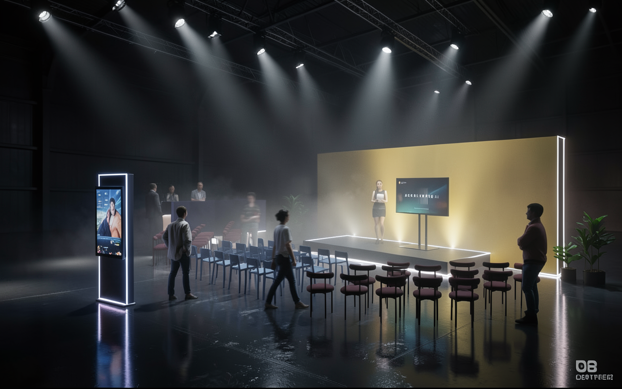 futuristic immersive exhibition space dark ambient environment dramatic cinematic lighting large open industrial hall with black ceiling strong directional spotlights with visible soft light beams soft atmospheric haze sleek modern presentation stage minimal premium design glossy but subdued floor reflections one modular exhibit kiosks with integrated screen slight motion blur on business people volumetric lighting high end experiential design ultra realistic octane render unreal engine style cinematic composition depth and contrast premium brand experience intimate and vibrant space