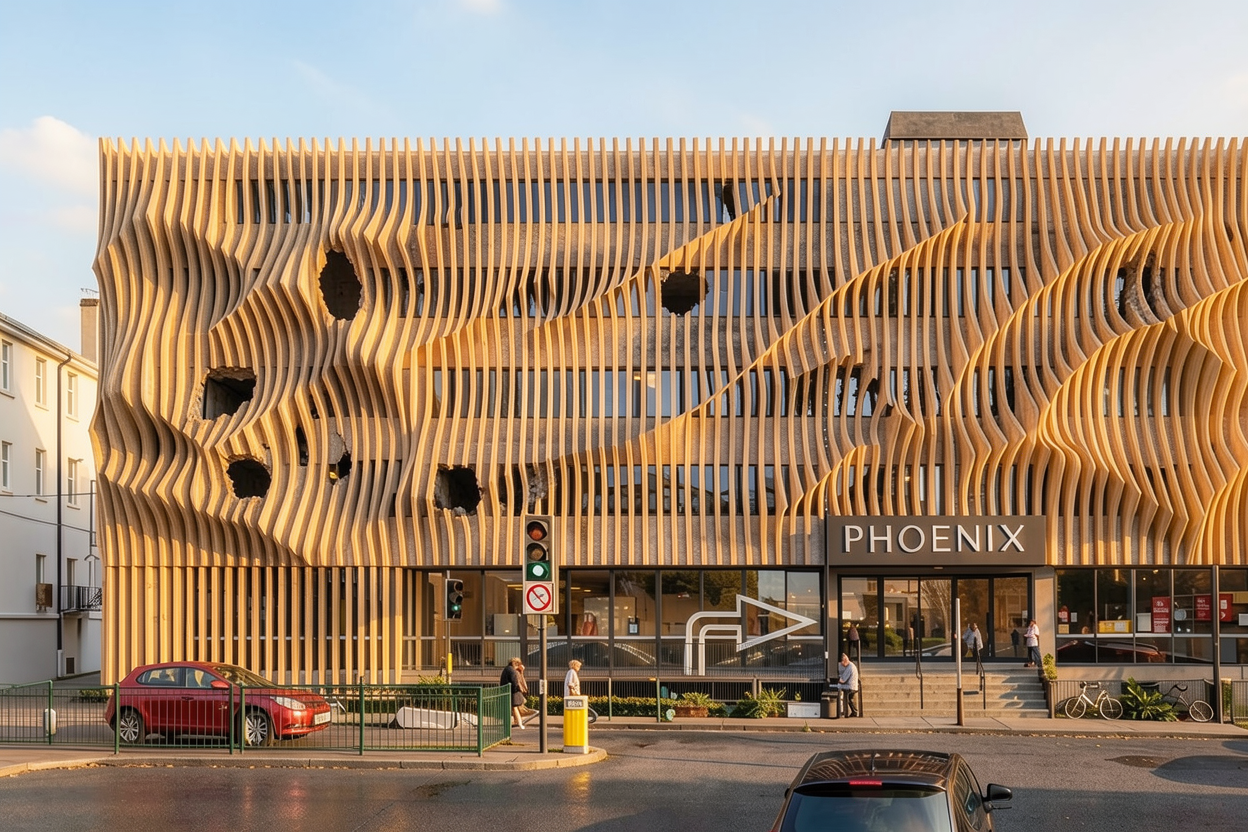 front view of a clean modern spa architectural exterior rendered in cinematic vibrant golden hour lighting with blue skies mountain modern with heavy timber architectural style stone wood siding beautifully lush green manicured landscape around structure with hedges and gardens black standing seam metal roof prominent cinematic oregon coast vegetation with golf course hole and douglas fir trees behind the spa in the background with this spa above the valley high fidelity photorealistic visualization crisp shadow falloff refined facade geometry soft atmospheric depth premium architectural photography mood ultra clean composition and materials dark trim around windows