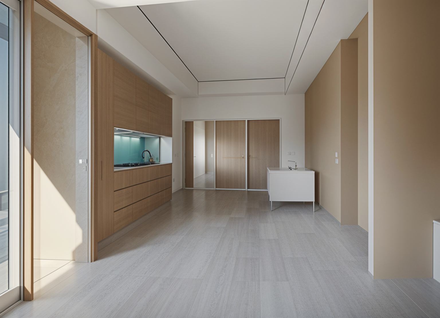 the front of the kitchen is white oak in rustic style and the body is a darker wood tiles are on the floor