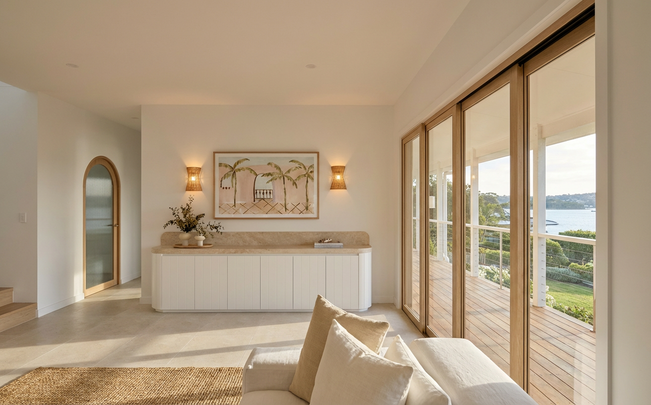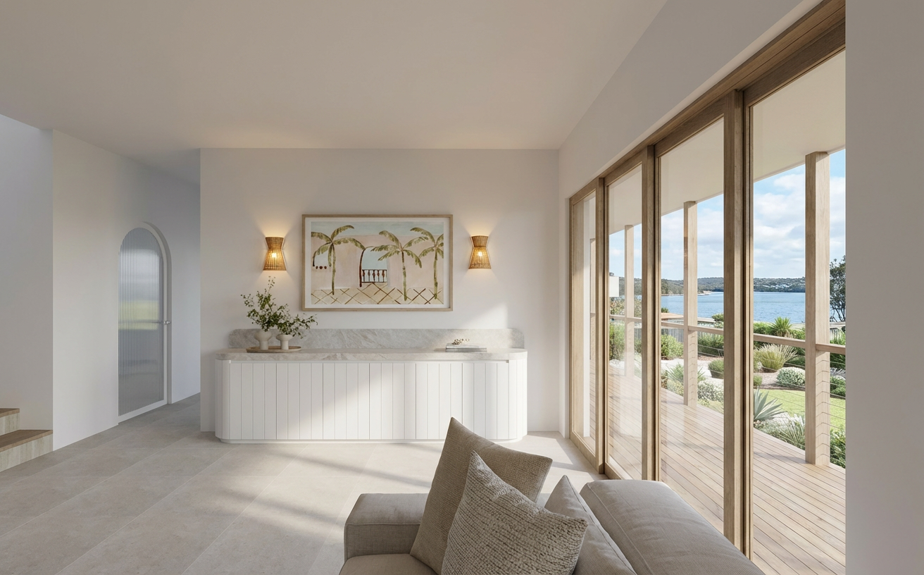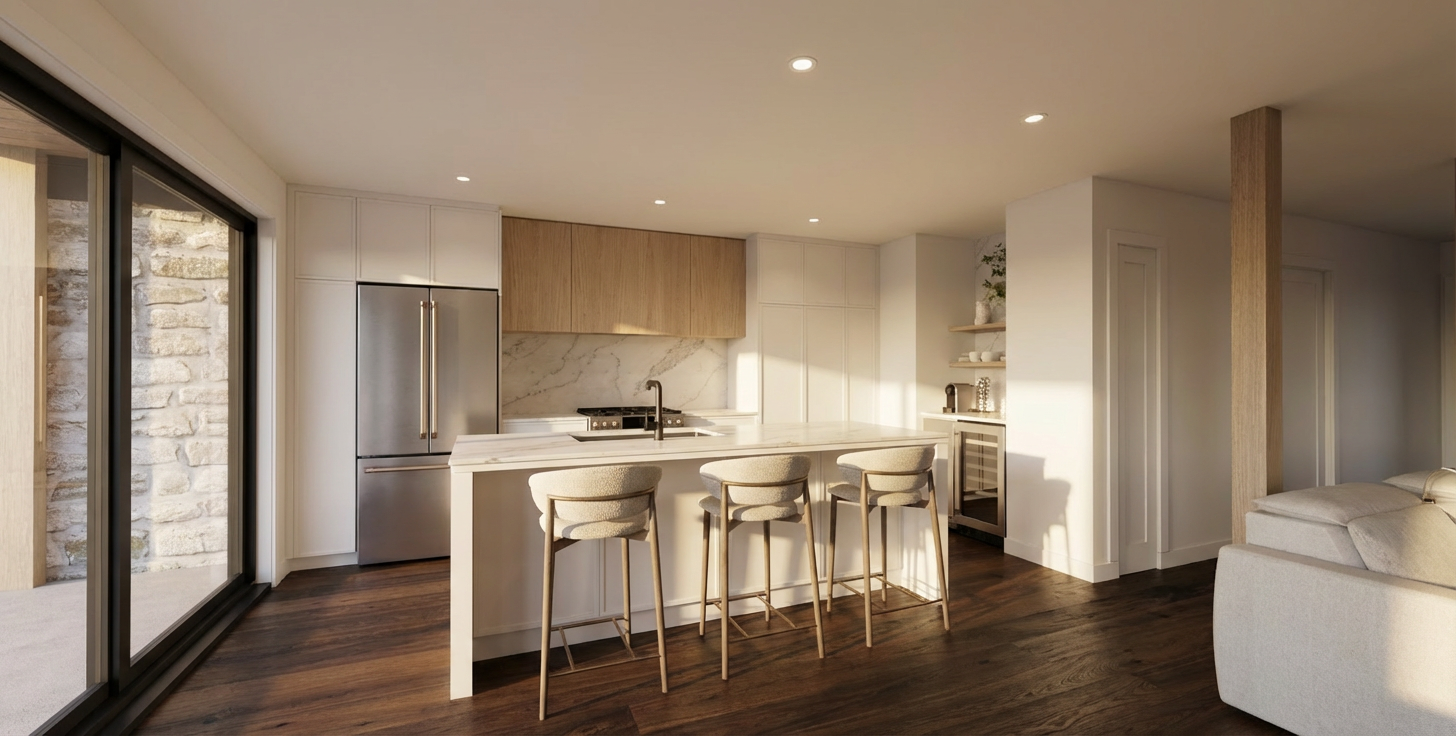 create a beautifully rendered modern kitchen interior the walls and ceilings are painted a soft white creating an airy and open feel use sleek matte white cabinets with subtle silver handles the countertops are a polished white marble with delicate gray veining introduce three wooden stools with a rich mahogany finish for warmth the floor is a stylish dark wood with shades of gray and brown creating contrast and complementing the kitchen s modern design the atmosphere should be cozy yet sophisticated with warm ambient lighting from elegant black pendant lamps hanging above the counter casting a soft glow add a small window on the right wall there is a covered porch on the right side with a shed roof make it a contemporary interior add a flat screen tv modern furniture table and seating