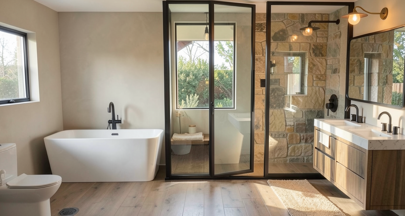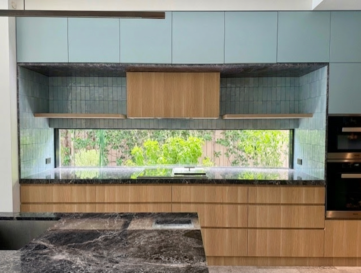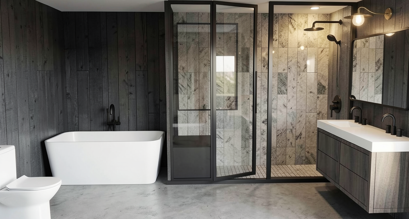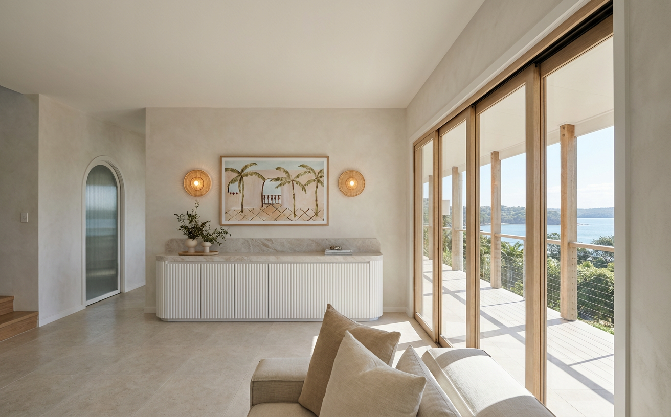 create a beautifully rendered modern kitchen interior the walls and ceilings are painted a soft white creating an airy and open feel use sleek matte white cabinets with subtle silver handles the countertops are a polished white marble with delicate gray veining introduce three wooden stools with a rich mahogany finish for warmth the floor is a stylish dark wood with shades of gray and brown creating contrast and complementing the kitchen s modern design the atmosphere should be cozy yet sophisticated with warm ambient lighting from elegant black pendant lamps hanging above the counter casting a soft glow add a small window on the right wall there is a covered porch on the right side with a shed roof make it a contemporary interior add a flat screen tv modern furniture table and seating