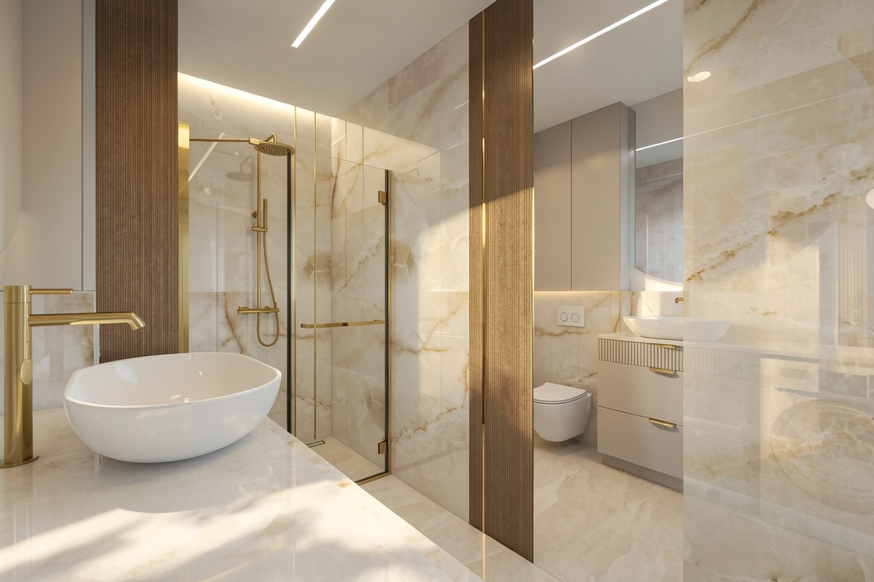 take this semi final render and enhance realism without altering any of the current image s geometry features or objects as well as image orientation no cropping zooming etc and make it 4k do not add any new objects the pendants are turned off there is no light emission do not add any new light sources or glows simply darken and define the existing materials apply a matte stone finish to the cylinders and a champagne metal finish to the bases keep the exact 3d geometry focus only on increasing the contrast and texture of the materials so they are clearly visible in the existing room light