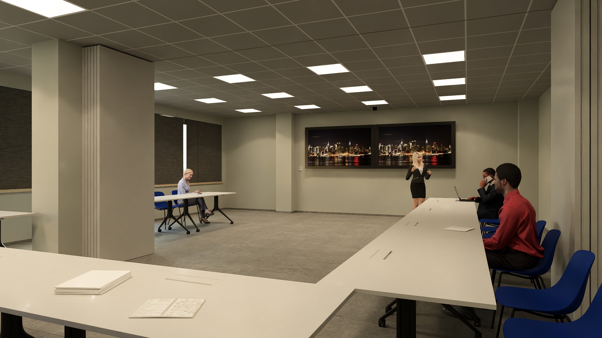modern conference training room interior do not change the existing layout geometry proportions walls ceiling openings furniture arrangement or camera angle preserve the original architectural structure exactly as in the input image increase overall brightness and natural light perception with soft balanced exposure and clean highlights apply a contemporary modern style with neutral tones white and light gray walls subtle warm accents add minimal decorative elements on the desks only small potted plants notebooks pens slim desk organizers and a few closed laptops clean and uncluttered decorations must be subtle professional and evenly distributed without overcrowding the desks soft integrated led lighting realistic shadows natural reflections photorealistic materials calm and elegant learning corporate atmosphere