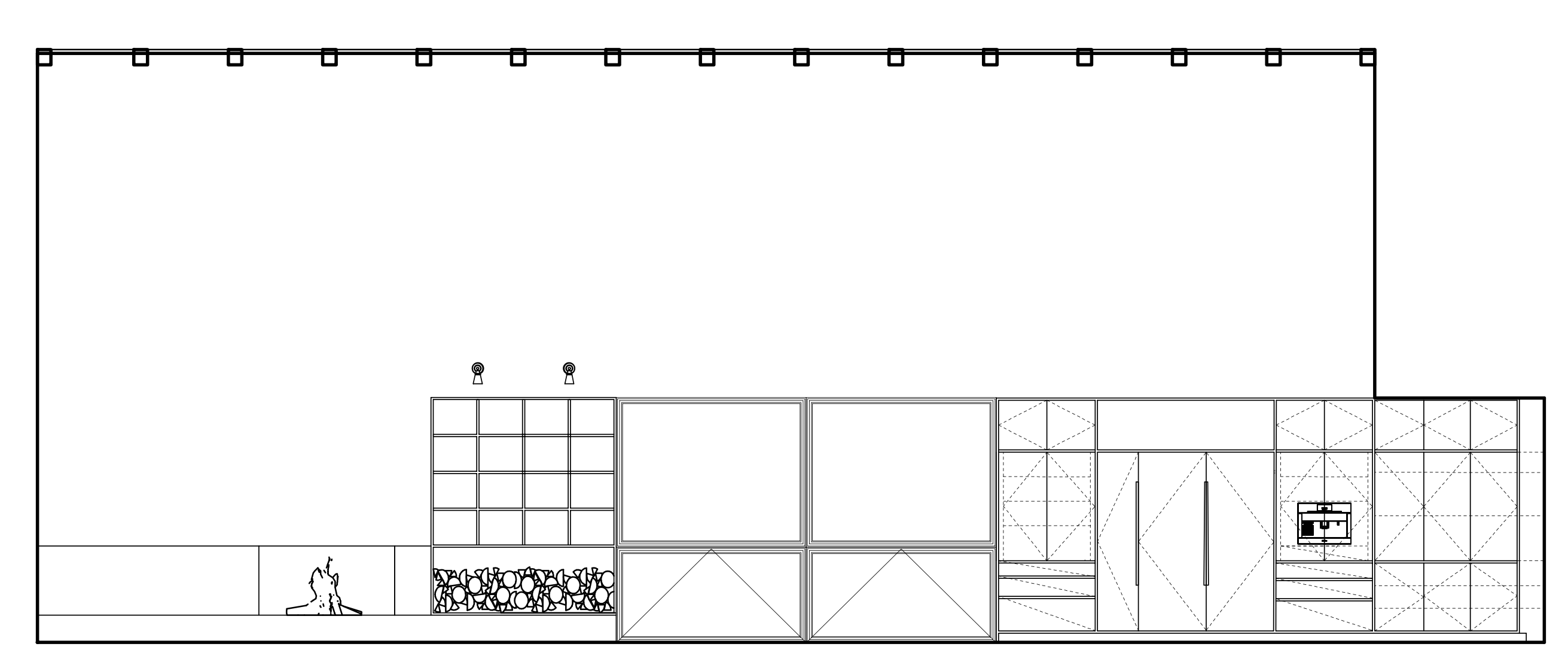 modern serene living room and kitchen with a shed roof applied natural stained white oak beams applied natural stain fir ceiling planks and a white oak cabinets bookcase firewood holder kitchen cabinets with integrated drawer pulls as shown and a stainless steel countertop as shown the floor is natural stain fir planks walls are a cream plaster fireplace hearth is a natural stone light fixture as shown in burnished nickel