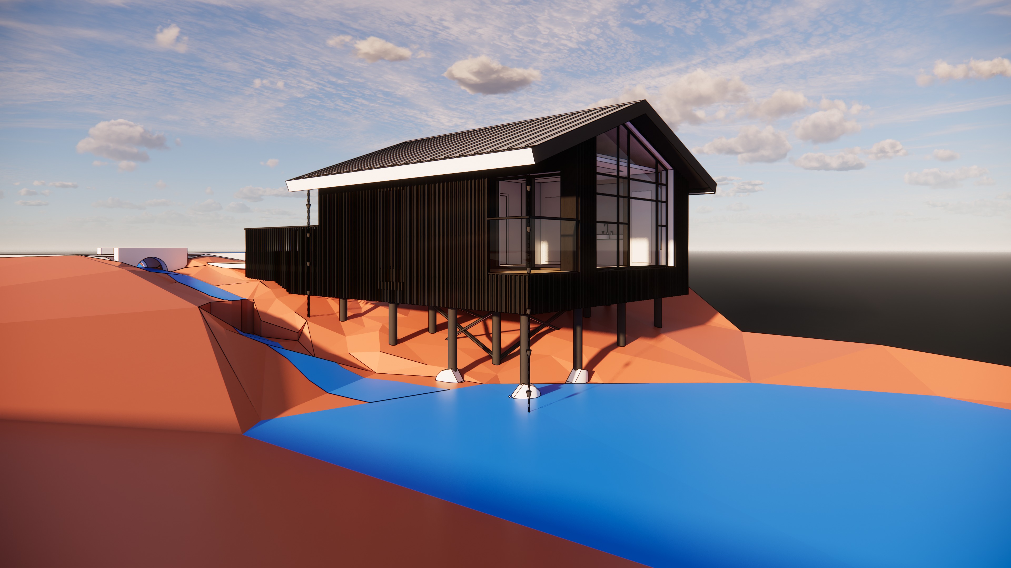 this is a house on top of small pond with small trees in the background the wall material is black burned wood please make it realistic and leave the landscape as it is the ground is dark brown with lush deciduous plants add darmera peltate plants under the house and around water leave the original structure i drawed the extent of the pond area in blue openings are in dark black