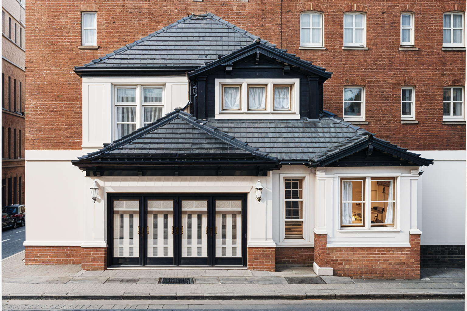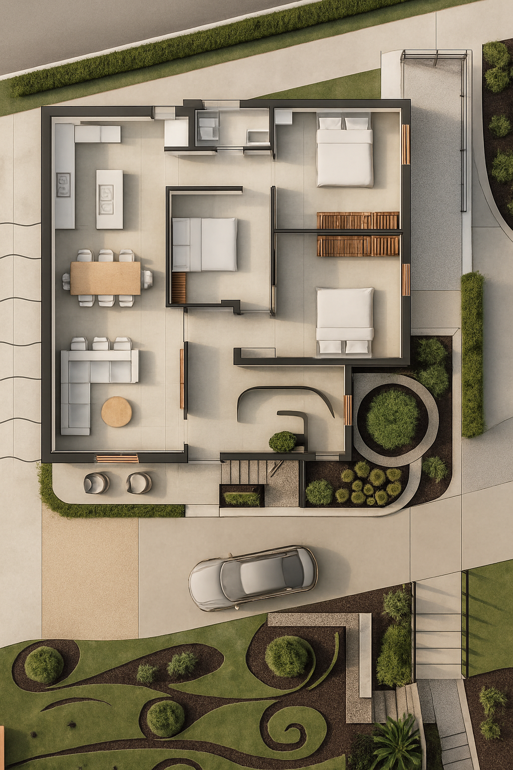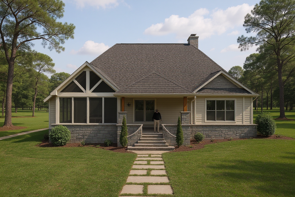 create a rendering of this elevation of a residential home with a screened porch a retaining wall surrounding a 500 sf flagstone patio with stairs leading to the turf grass in a golf course community the retaining wall extends 10 feet beyond the screened porch and foundation of the home