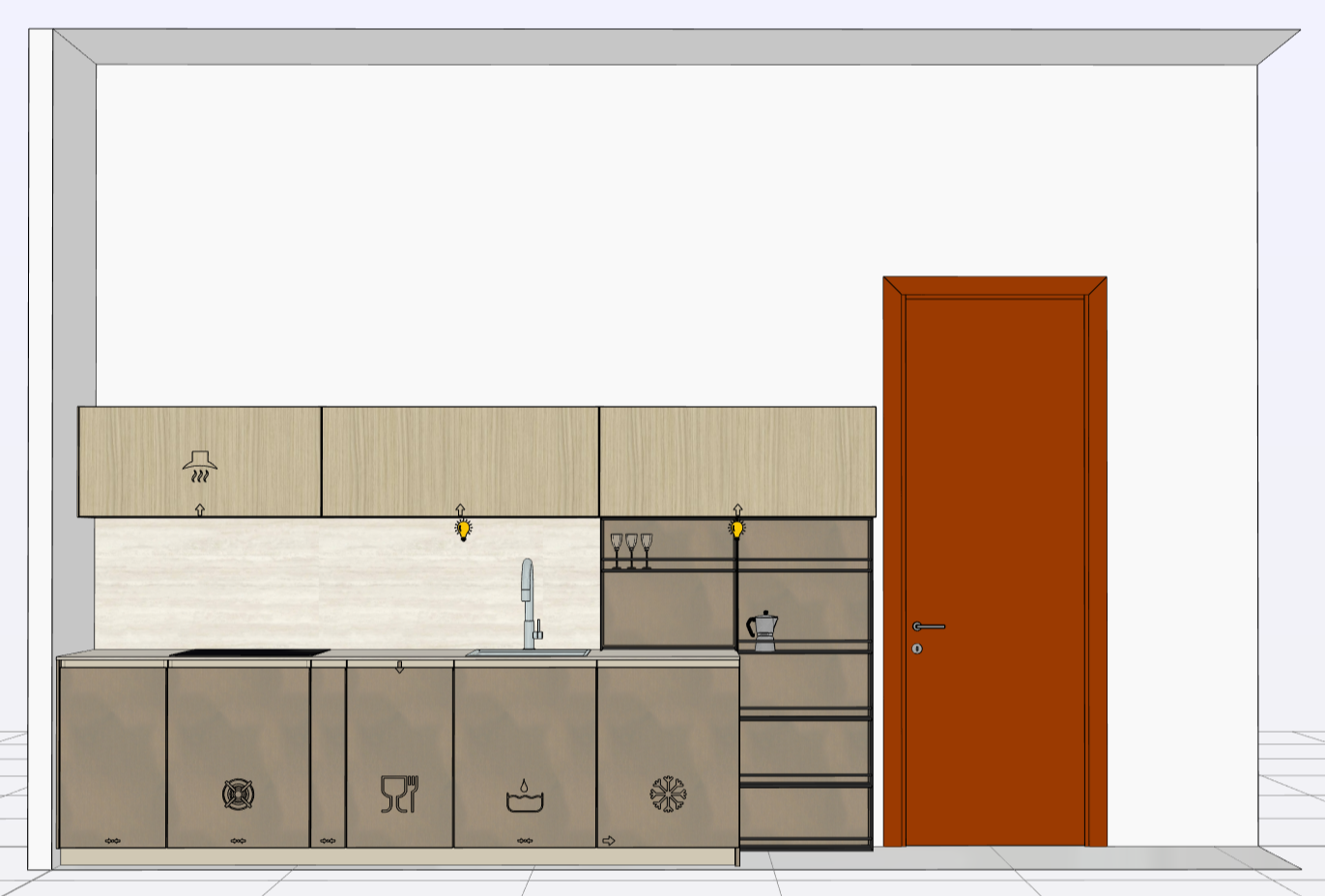 door terracota color metal champagne base fasades wall unit fasades natural oak top and back panel travertin