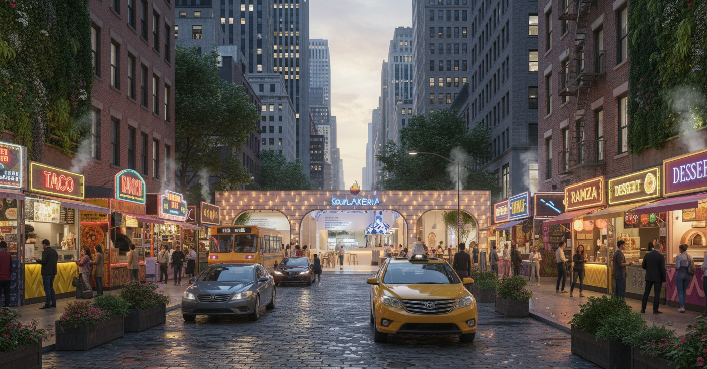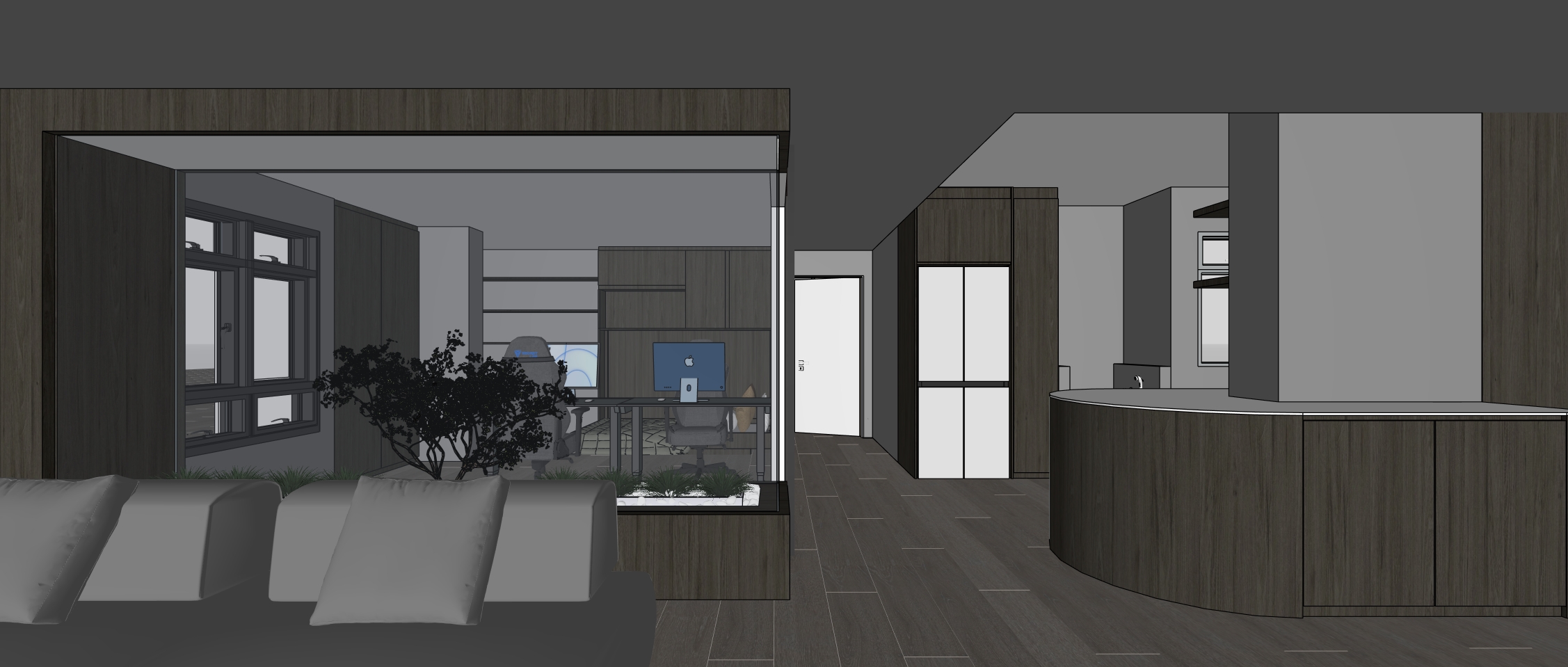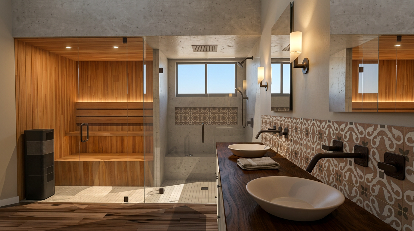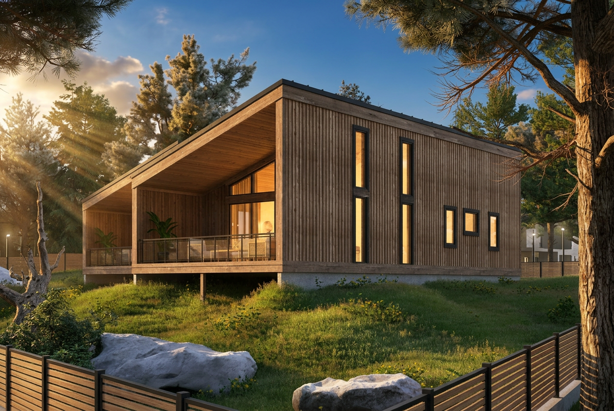 a modern minimalist kitchen with a serene atmosphere the cabinets are a soft matte white paired with light wood lower cabinets a sleek black refrigerator complements the design the flooring is in a muted gray wood texture the walls are a calming light gray feature a round wooden table with a natural light oak finish surrounded by comfortable textured gray fabric chairs the countertop is a smooth beige stone and sunlight gently streams through a nearby window casting a warm glow
