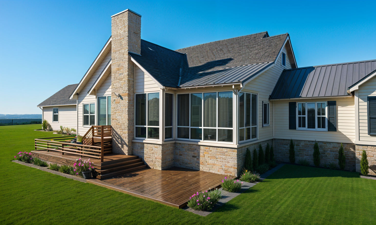 addd deck outside the windows and sky with palm trees but no ocean