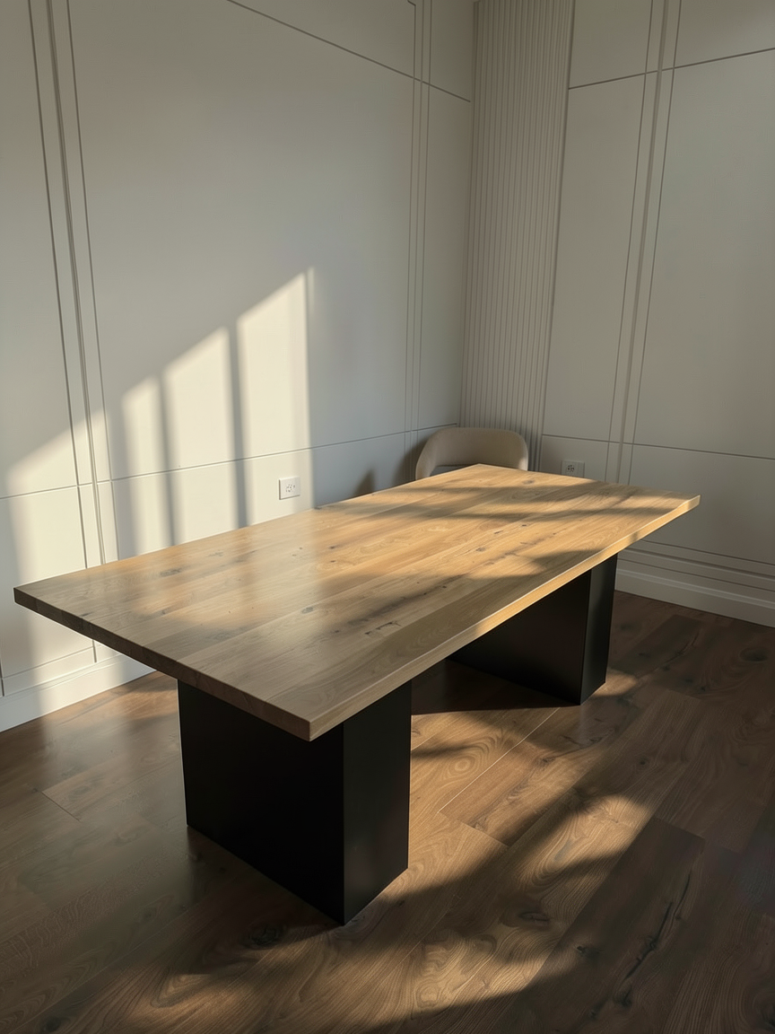 editorial architectural interior photography of a minimalist dining space calm museum like atmosphere soft natural light entering the room deep shadows and light gradients cinematic depth quiet luxury human camera feeling slightly imperfect composition high end european design aesthetic focus on mood space and light only preserve the exact same product geometry and materials as the reference image do not change the table in any way no people no decorations no logos no text ultra realistic