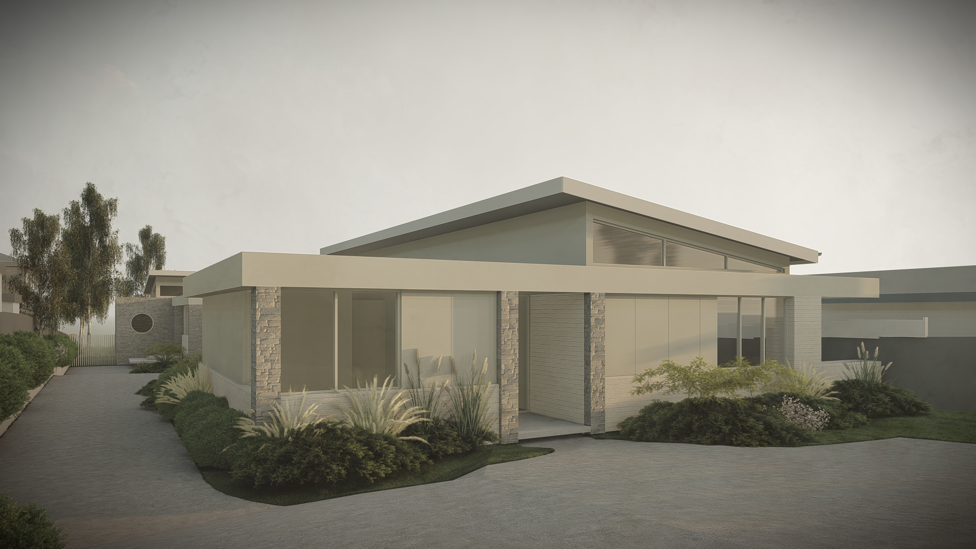 photorealistic architectural rendering of a contemporary australian rural home enhancing an existing lumion base image introduce soft atmospheric depth abundant natural light with a warm low angle sun early morning or late afternoon creating gentle highlights and soft shadows the front of the building needs direct sunlight on an oblique angle refine materiality to feel tactile and true to life cement sheet to be smooth paint finish stone with natural irregularity and depth brick to be painted white metal with subtle reflectivity and imperfections glazing with realistic reflections and slight interior transparency add understated warm interior lighting 2700k 3000k to create a soft glow ensuring it feels natural and not overexposed balance interior and exterior lighting so neither dominates enhance landscaping with slight movement and realism softened edges and subtle tonal variation in grasses and foliage introduce light environmental effects e g faint haze diffused background to increase depth and atmosphere overall mood should be warm calm and evocative slightly ethereal but grounded in realism avoid overly dramatic contrast or stylisation aim for a premium architectural photography aesthetic with a cinematic softness