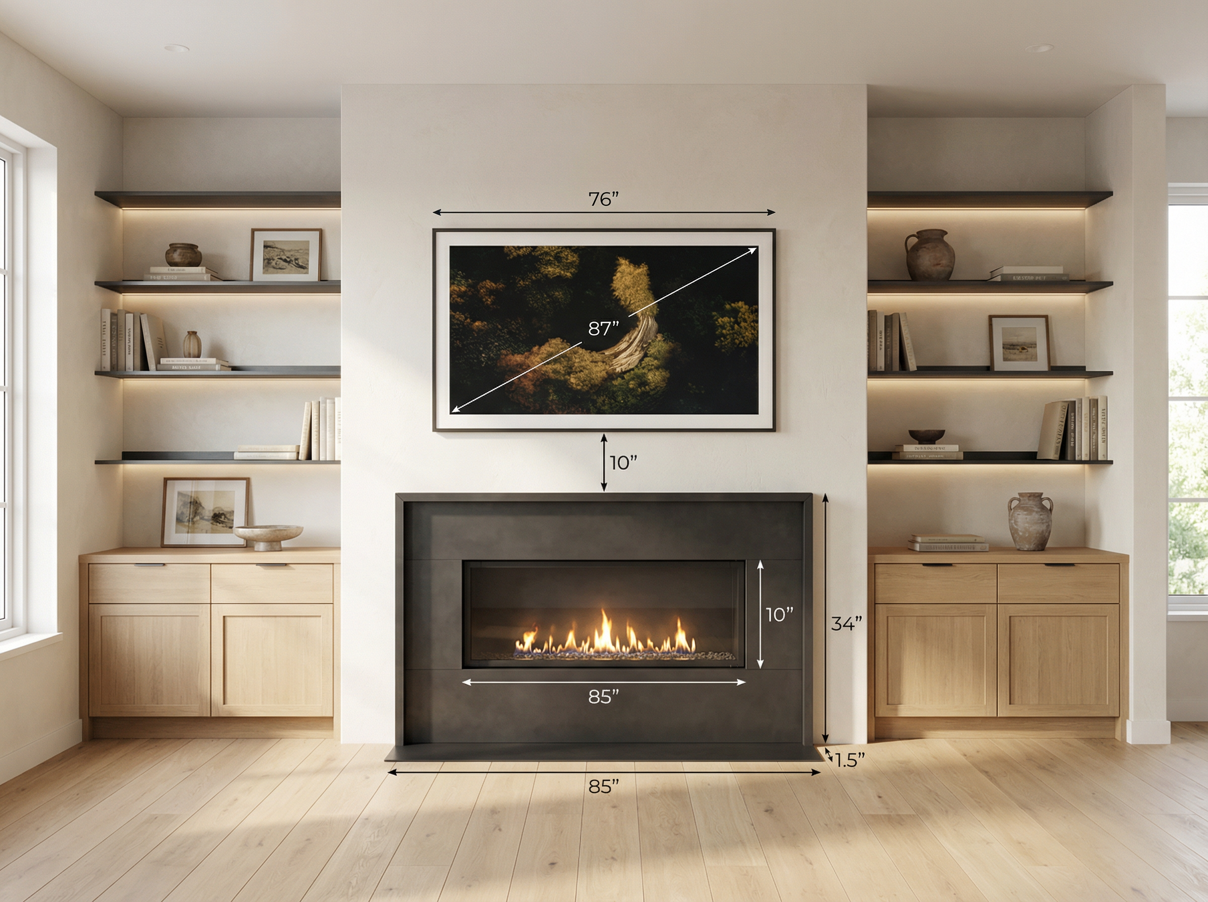 create a photorealistic interior rendering of a custom fireplace feature wall in a modern transitional style straight on elevation view the center features a rectangular fireplace with a slim matte dark charcoal steel surround deep graphite tone subtle texture not glossy above the fireplace is a flush mounted samsung frame tv with a thin black frame displaying neutral abstract art the fireplace chase extends floor to ceiling in warm off white plaster with subtle hand troweled movement on both sides of the fireplace are symmetrical built in units with lower inset cabinets in light natural white oak warm honey beige tone matte finish no red no gray the cabinet faces side panels and vertical dividers are wood the outer surround of the cabinetry is wood not metal above the lower cabinets are open shelves important material clarification the horizontal shelves themselves are dark charcoal steel matching the fireplace surround the shelves are thin metal plates minimal profile floating appearance the vertical supports for the shelves are also dark charcoal steel the wood should only appear on lower cabinet doors cabinet face frames and side panels interior cabinet backing optional the metal should only appear on fireplace surround all open shelving horizontal shelves and vertical supports do not wrap the cabinetry in metal do not make the shelf surfaces wood the shelving planes must clearly read as dark steel flooring wide plank light natural oak similar tone to cabinetry lighting soft daylight subtle shadowing to emphasize contrast between warm wood and dark steel high resolution architectural visualization realistic materials balanced contrast