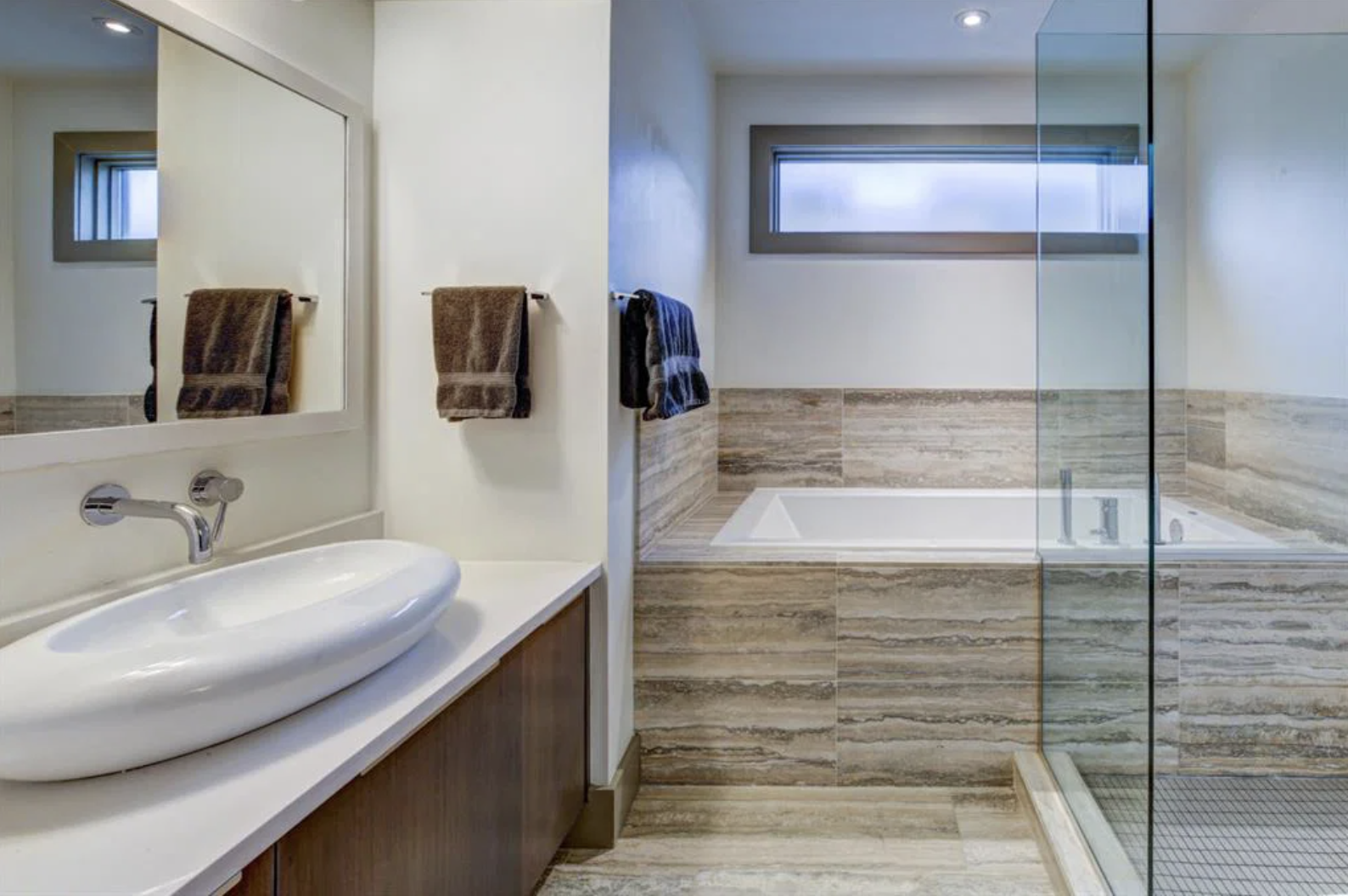 create a modern bathroom with a modern hotel bathroom vision with walnut and marble change the sink and add two with walnut vanity under the window replace the existing sink location with a cedar sauna for 2 people